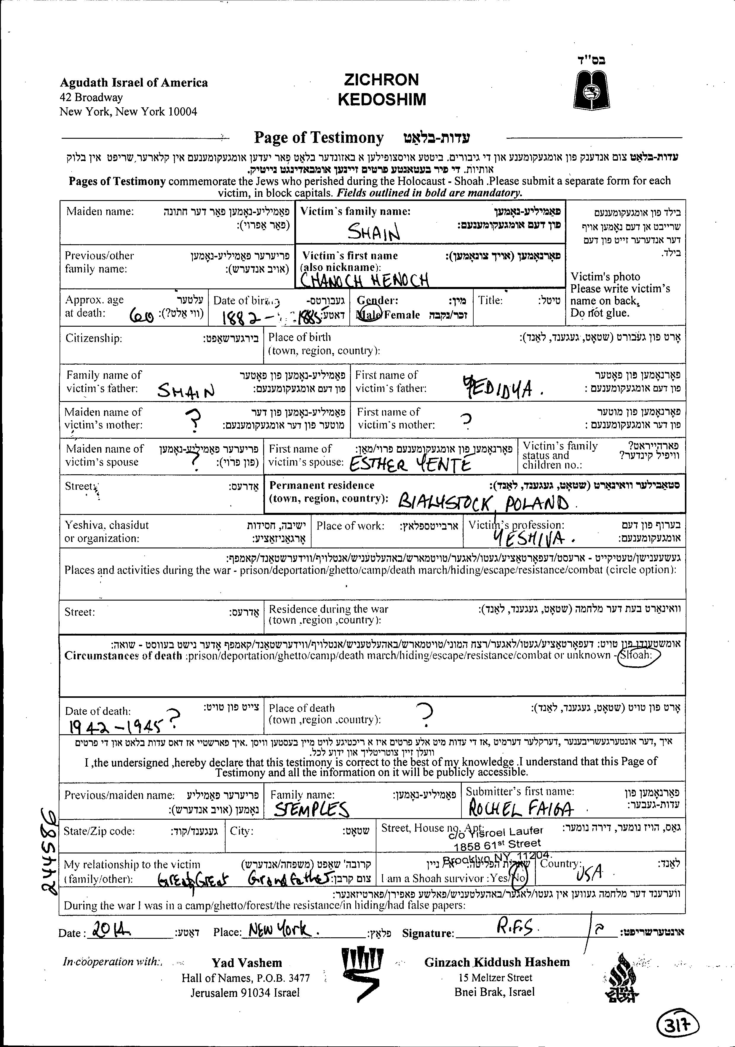 Chanoch Shain wurde im Jahr 1882 geboren. Er war der Sohn von Yedidya. Er war mit Esther Yente Verheiratet. Vor dem Zweiten Weltkrieg lebte er in Bialystok, Polen.