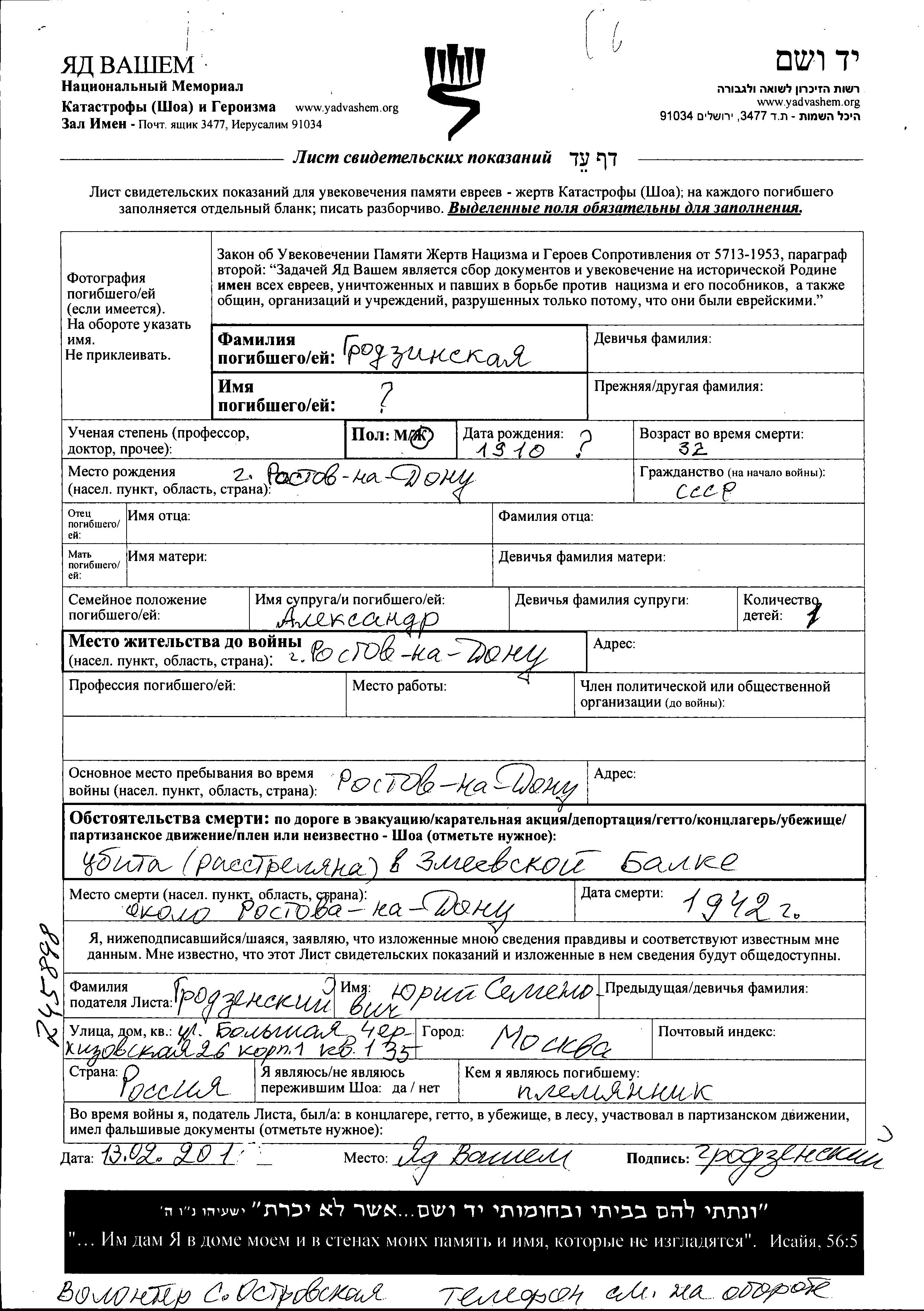 Vorname unbekannt Grodzenskaya wurde im Jahr 1910 in Rostov na Donu, Russland (UdSSR) geboren. Sie war mit Aleksandr Verheiratet. Vor dem Zweiten Weltkrieg lebte sie in Rostov na Donu, Russland (UdSSR). Während des Krieges war sie in Rostov na Donu, Russland (UdSSR).