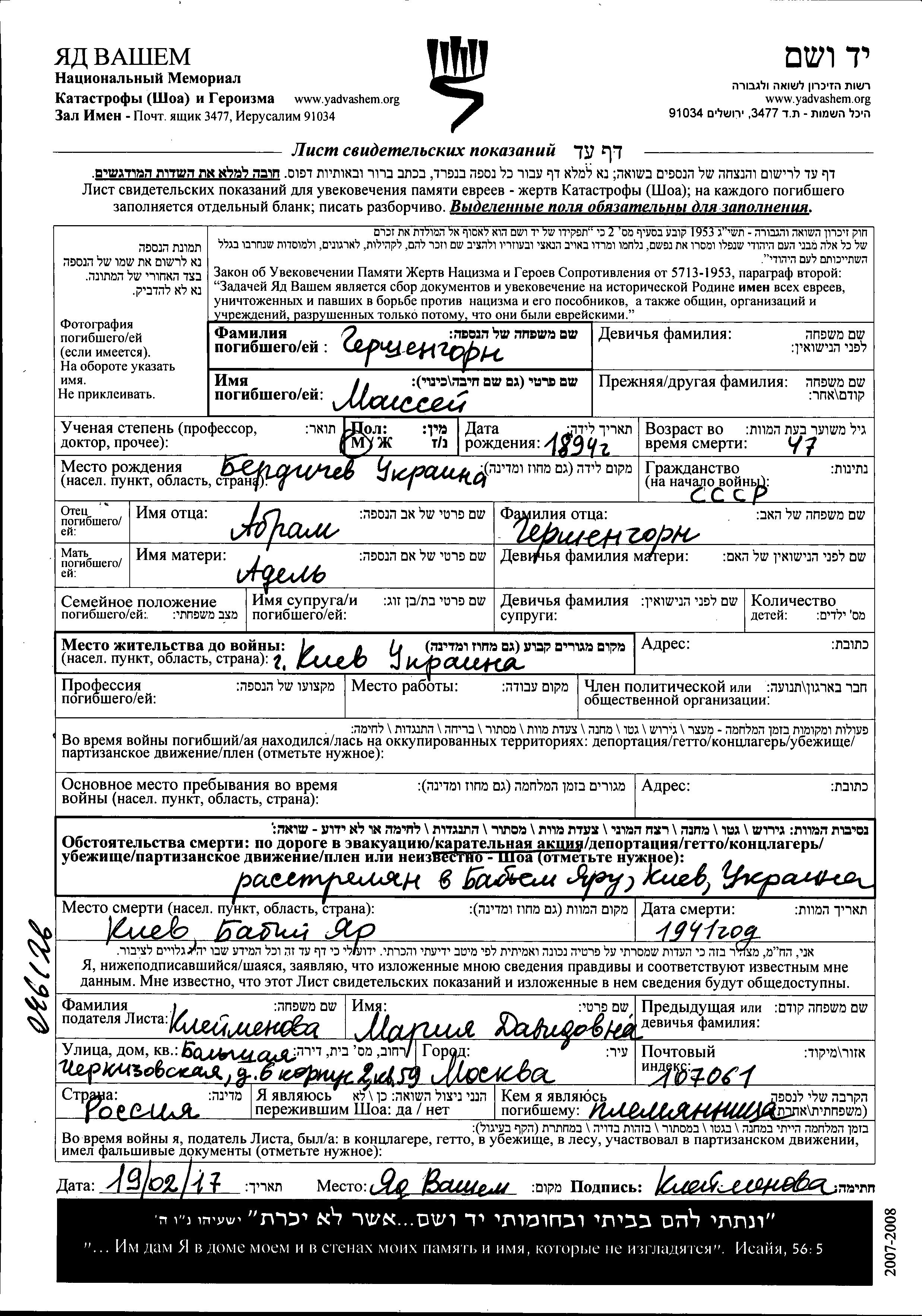 Moissey wurde in der Schoah ermordet. Todesort: Babiy Yar, Ukraine (UdSSR) im Jahr 1941.