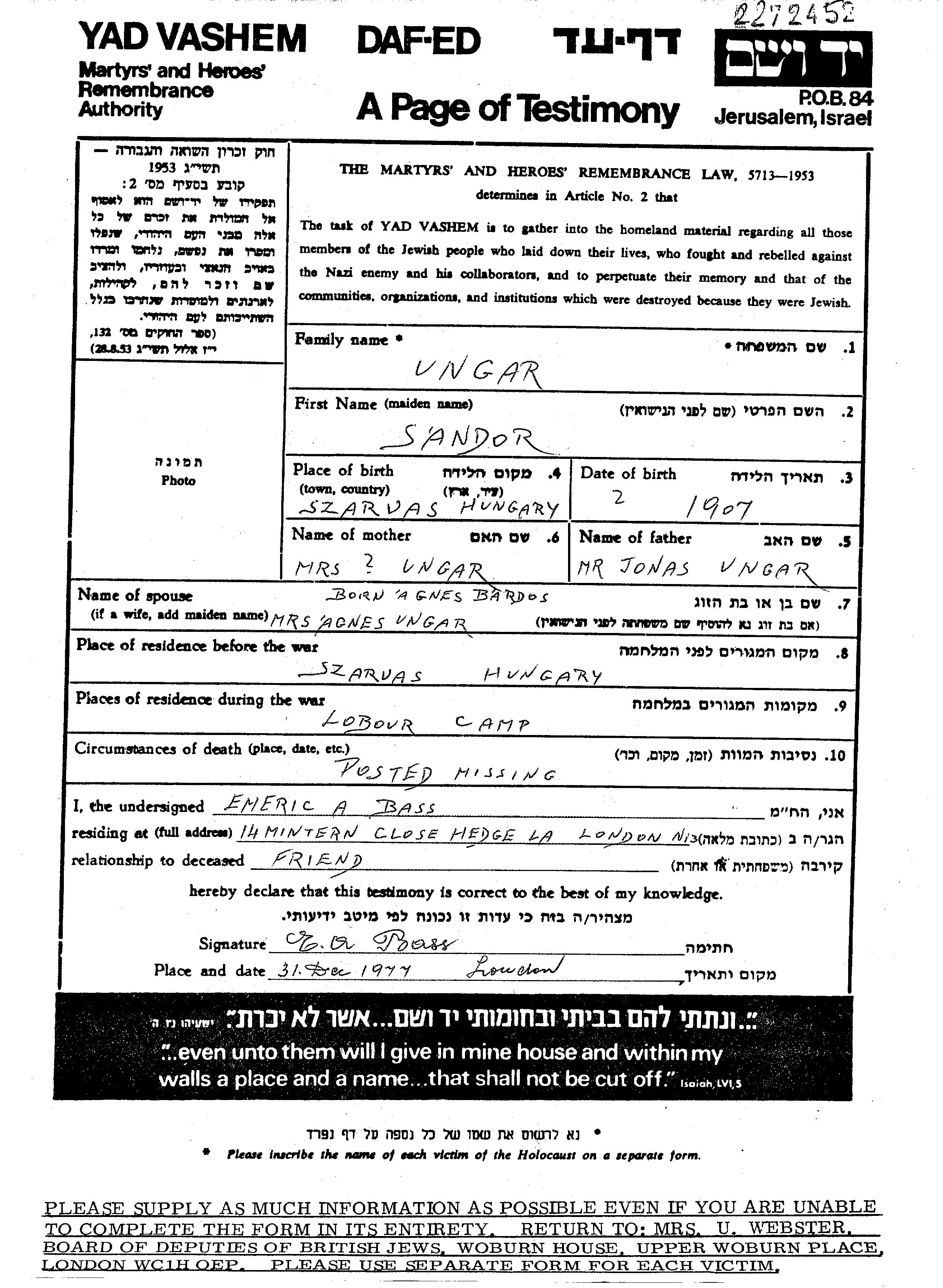Sandor Ungar wurde im Jahr 1907 in Szarvas, Ungarn geboren. Er war der Sohn von Jonas. Er war mit Agnes Verheiratet. Vor dem Zweiten Weltkrieg lebte er in Szarvas, Ungarn.