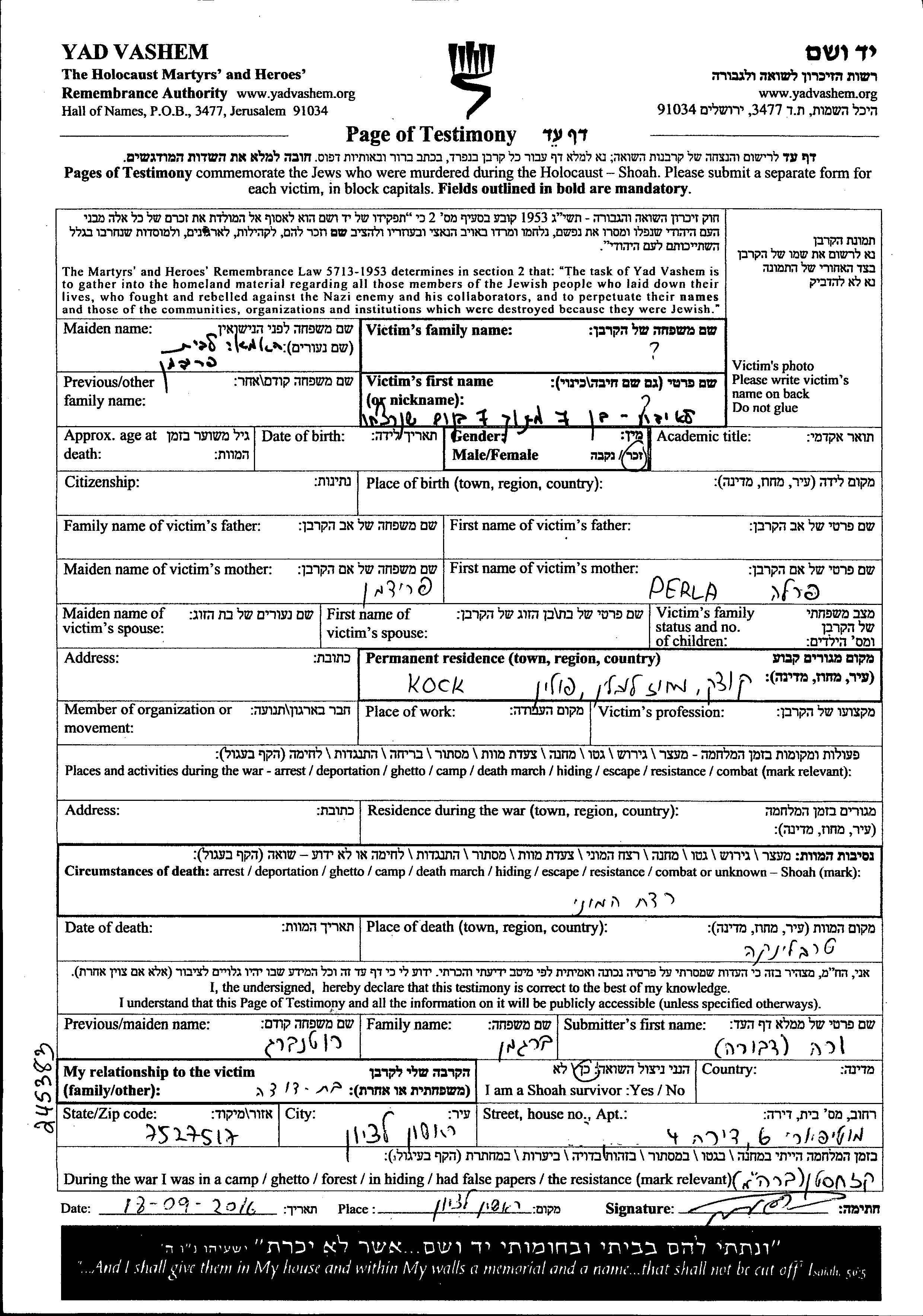 Vorname unbekannt Name unbekannt wurde Er war der Sohn von Perla, geb. Fridman. Vor dem Zweiten Weltkrieg lebte er in Kock, Polen.