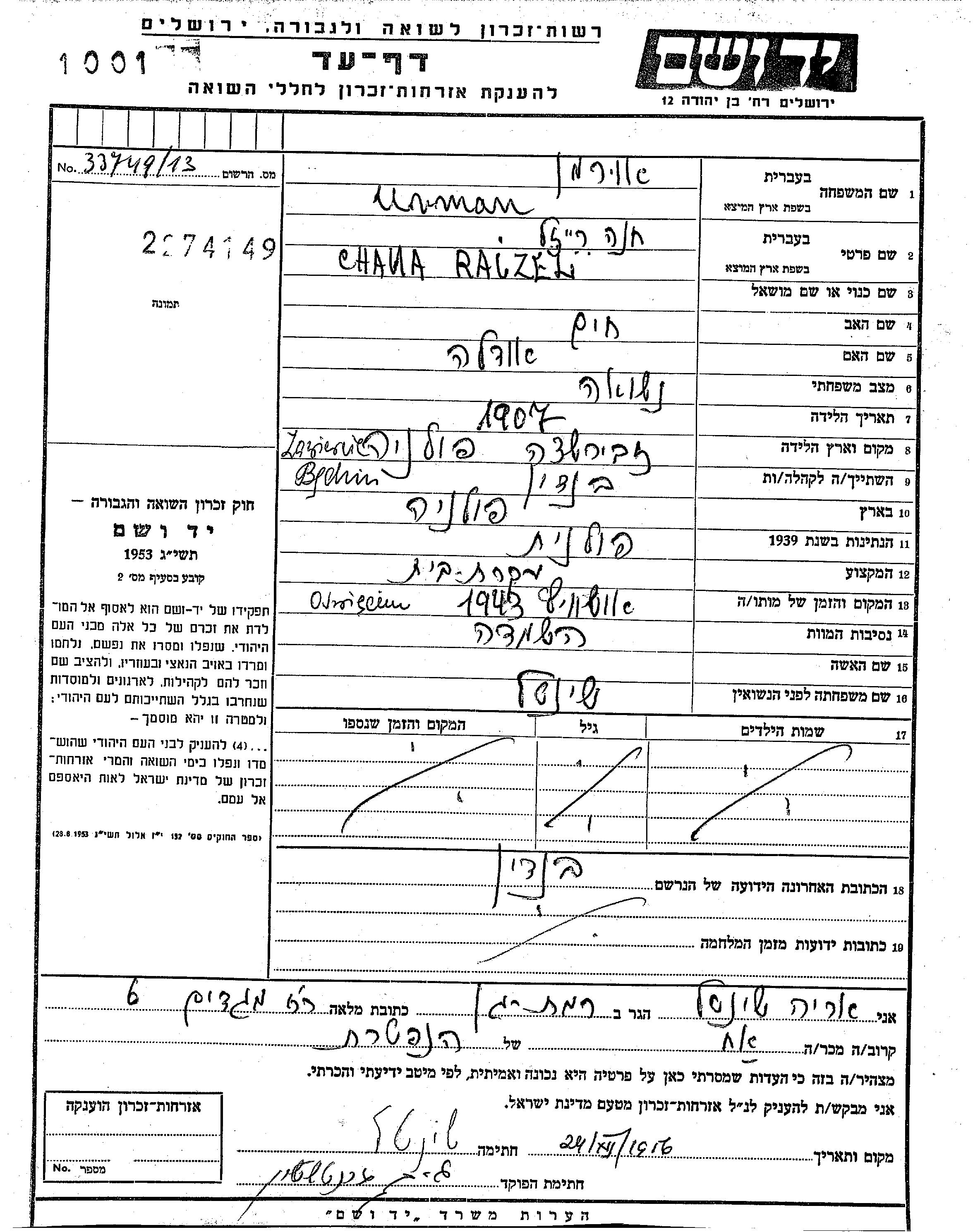 Chana Raizel wurde in der Schoah ermordet. Todesort: Auschwitz, Polen im Jahr 1943.