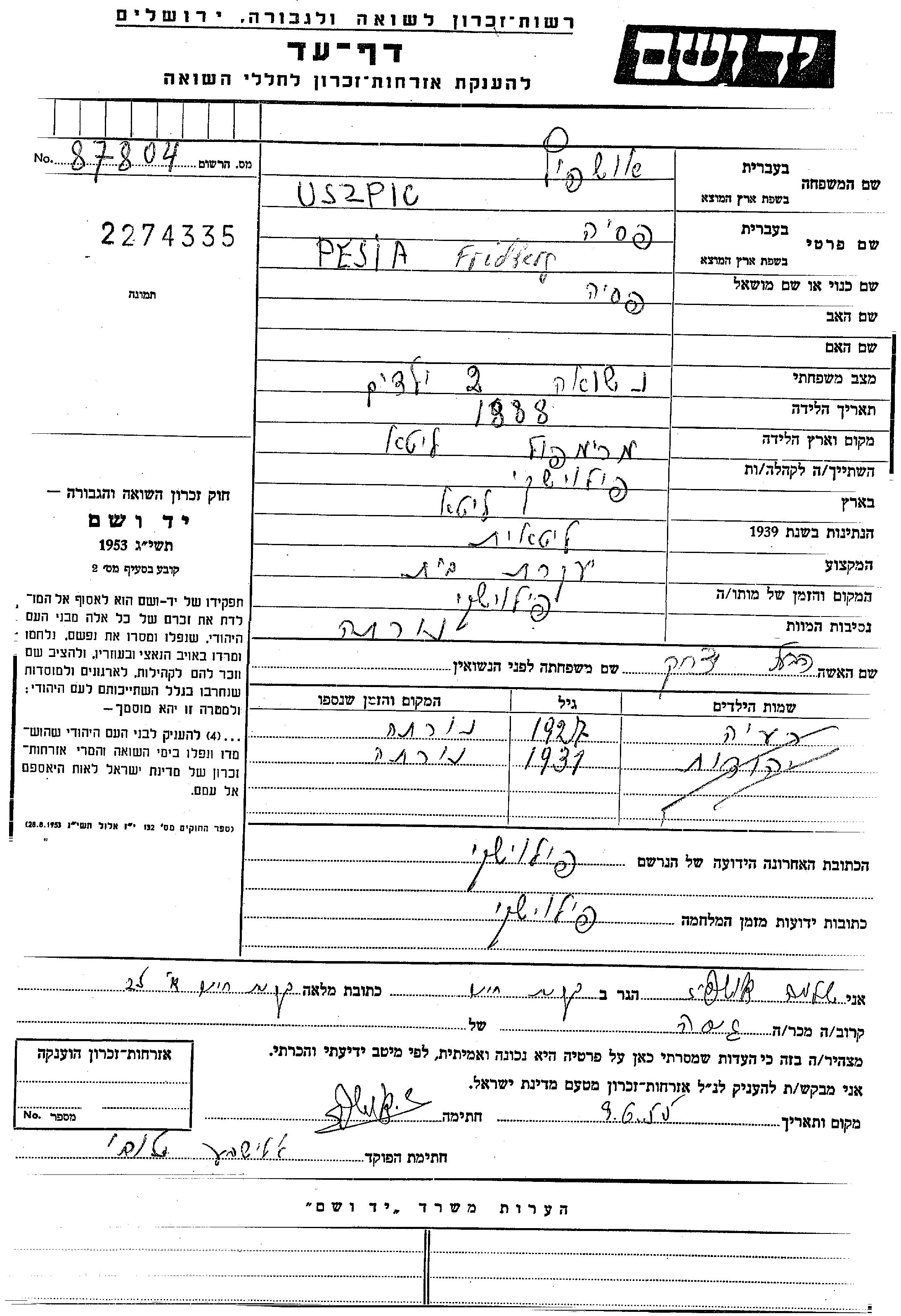 Pesia Uszpic, geb. Fridberg wurde im Jahr 1888 in Mariampol, Litauen geboren. Sie war Hausfrau und mit Icchak Verheiratet. Vor dem Zweiten Weltkrieg lebte sie in Pilviskis, Litauen. Während des Krieges war sie in Pilviskis, Litauen.