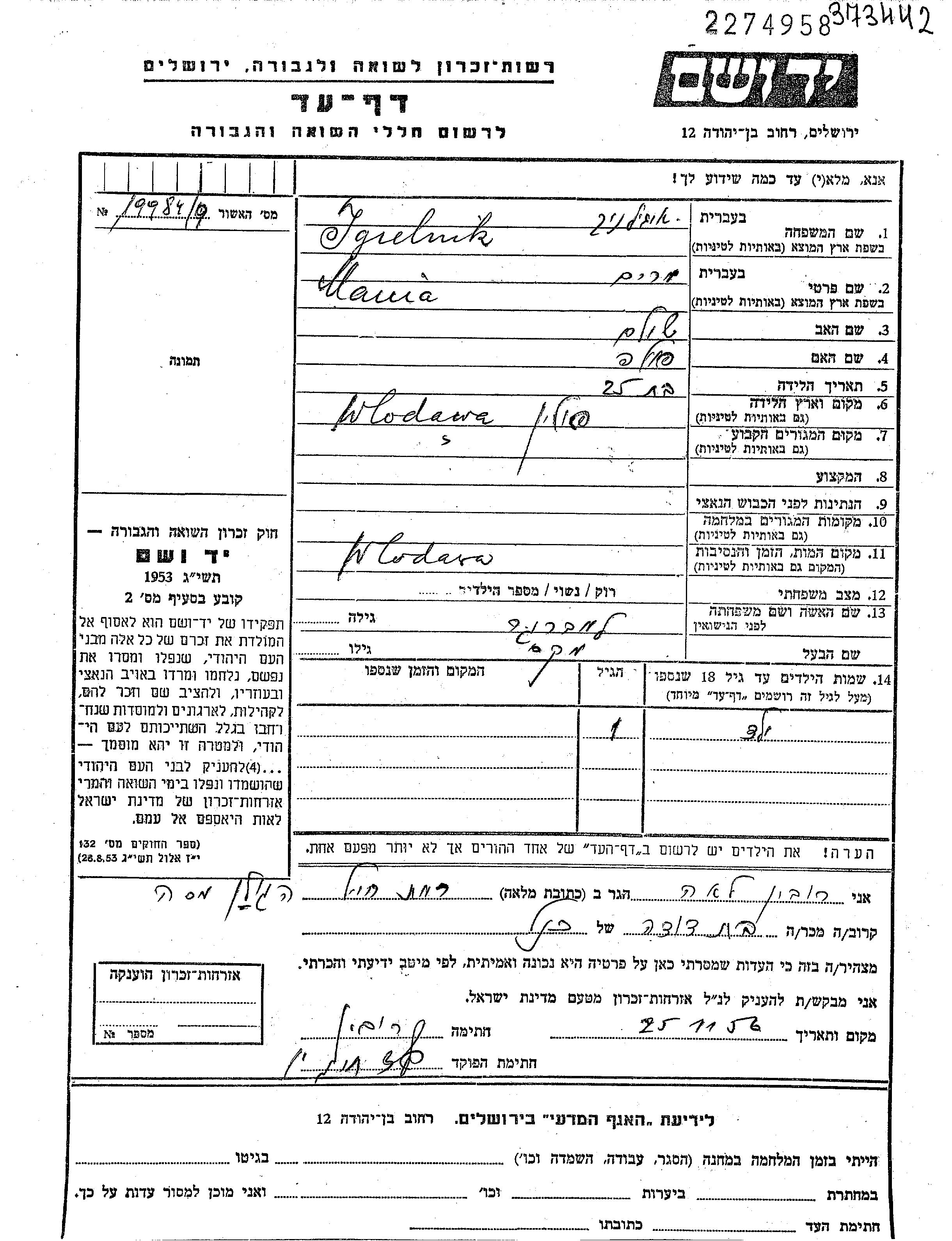 Igielnik Mania Miriam Wlodawa, Polen Gedenkblatt