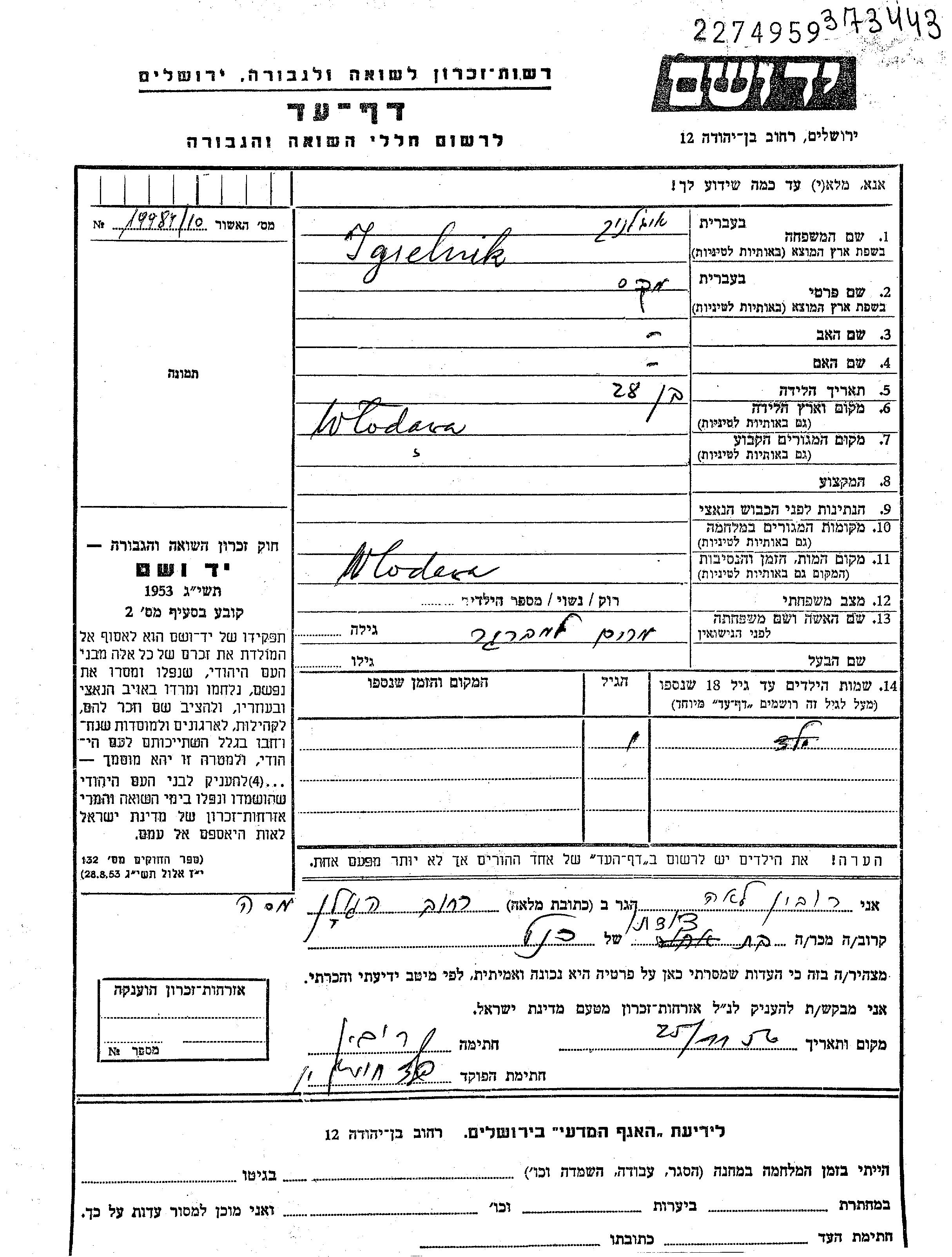 Yad Vashem - Gedenkblätter Sammlung