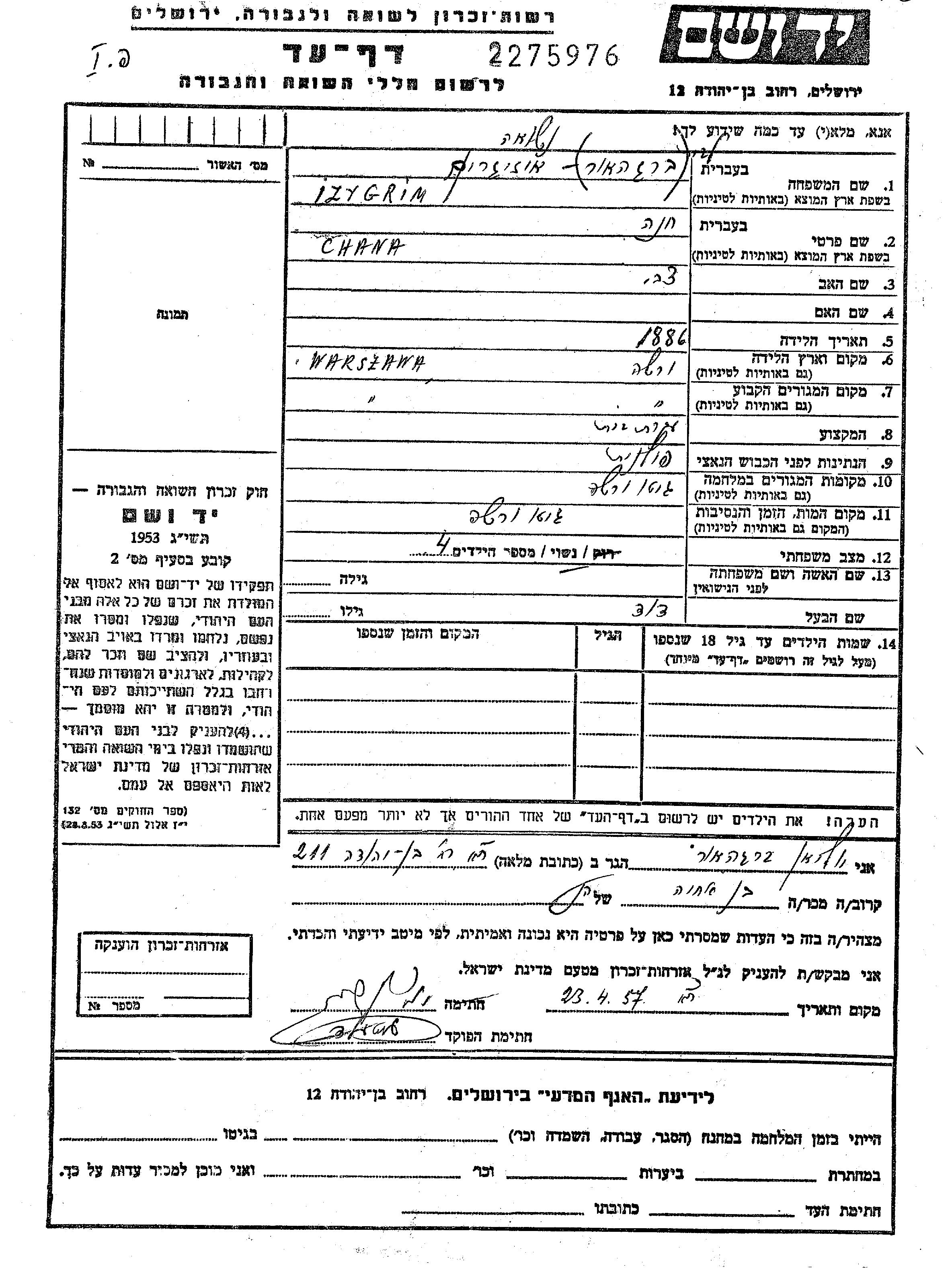 Chana Izygrim, geb. Berghauer wurde im Jahr 1886 in Warszawa, Polen geboren. Sie war die Tochter von Tzvi. Sie war Hausfrau und mit Dawid Verheiratet. Vor dem Zweiten Weltkrieg lebte sie in Warszawa, Polen. Während des Krieges war sie in Warszawa, Polen.