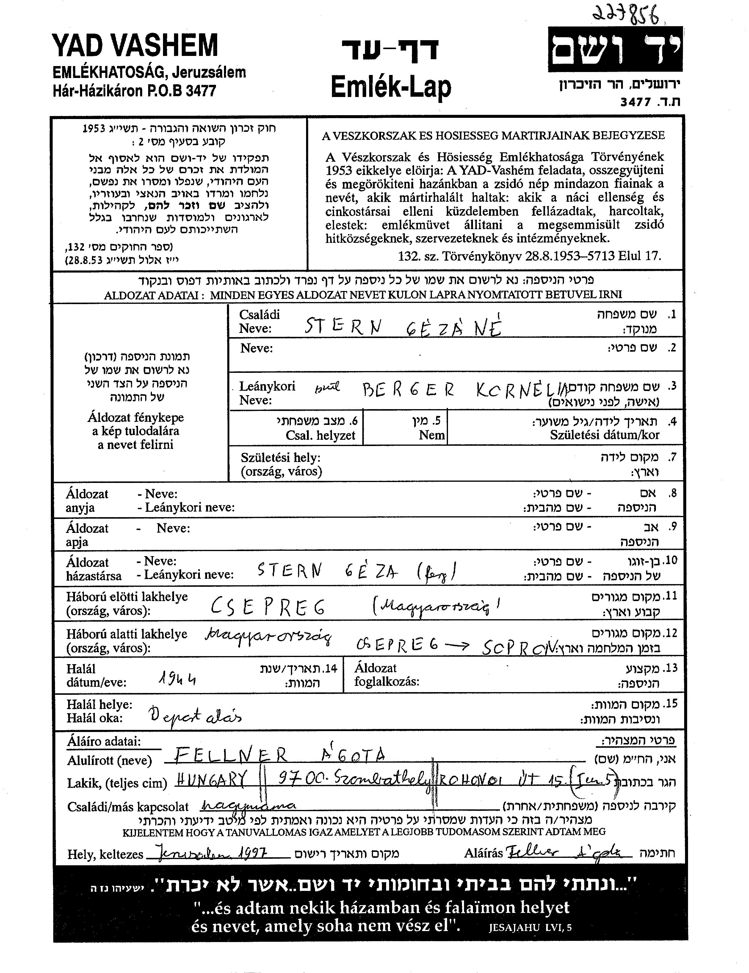 Kornelia Stern, geb. Berger. Sie war mit Geza Verheiratet. Vor dem Zweiten Weltkrieg lebte sie in Csepreg, Ungarn. Während des Krieges war sie in Sopron, Ungarn.