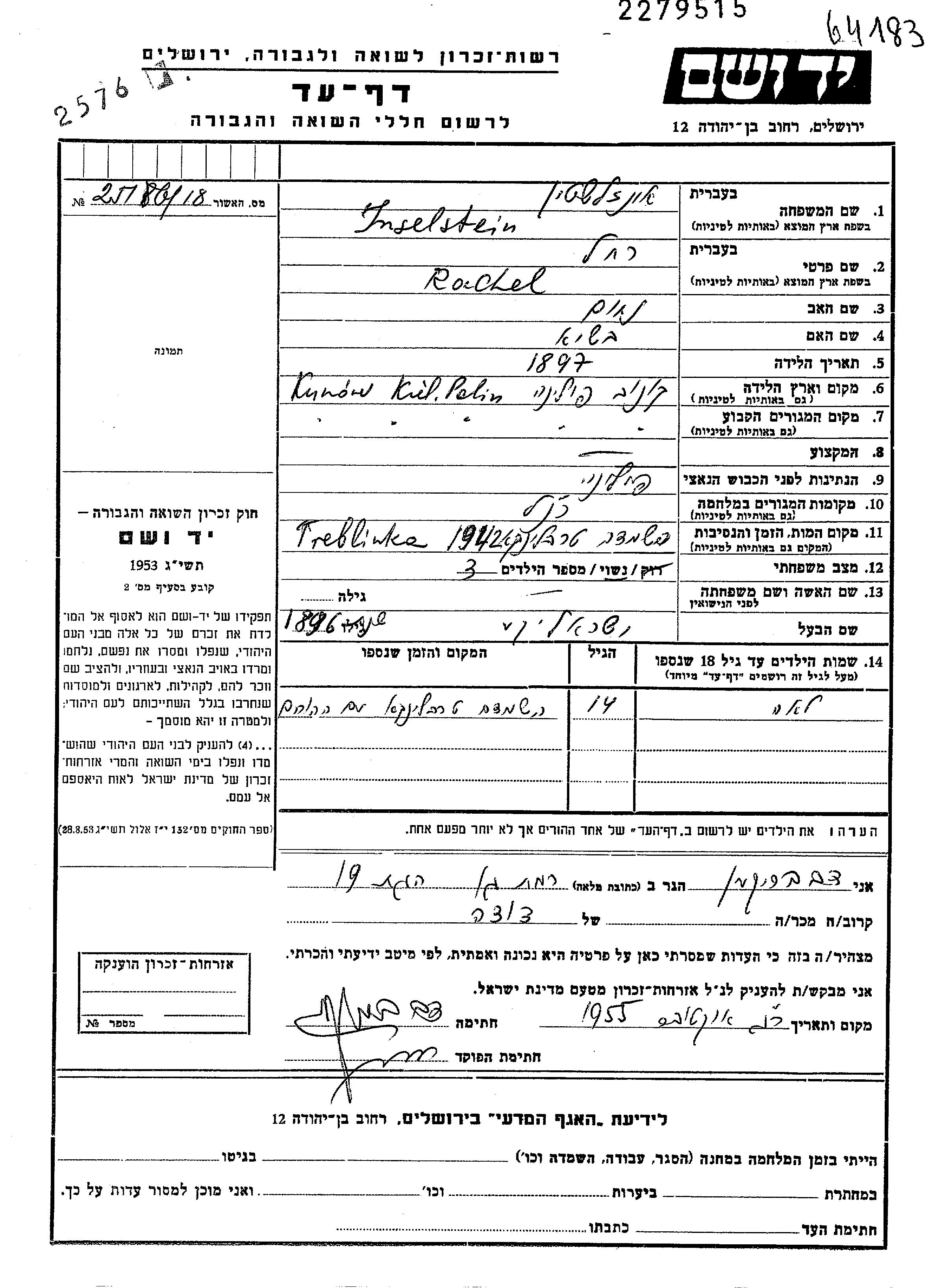 Rachel Inselstein, geb. Brokman wurde im Jahr 1897 in Kunow, Polen geboren. Sie war die Tochter von Nakhum und Besia. Sie war mit Israel Verheiratet. Vor dem Zweiten Weltkrieg lebte sie in Kunow, Polen. Während des Krieges war sie in Kunow, Polen.