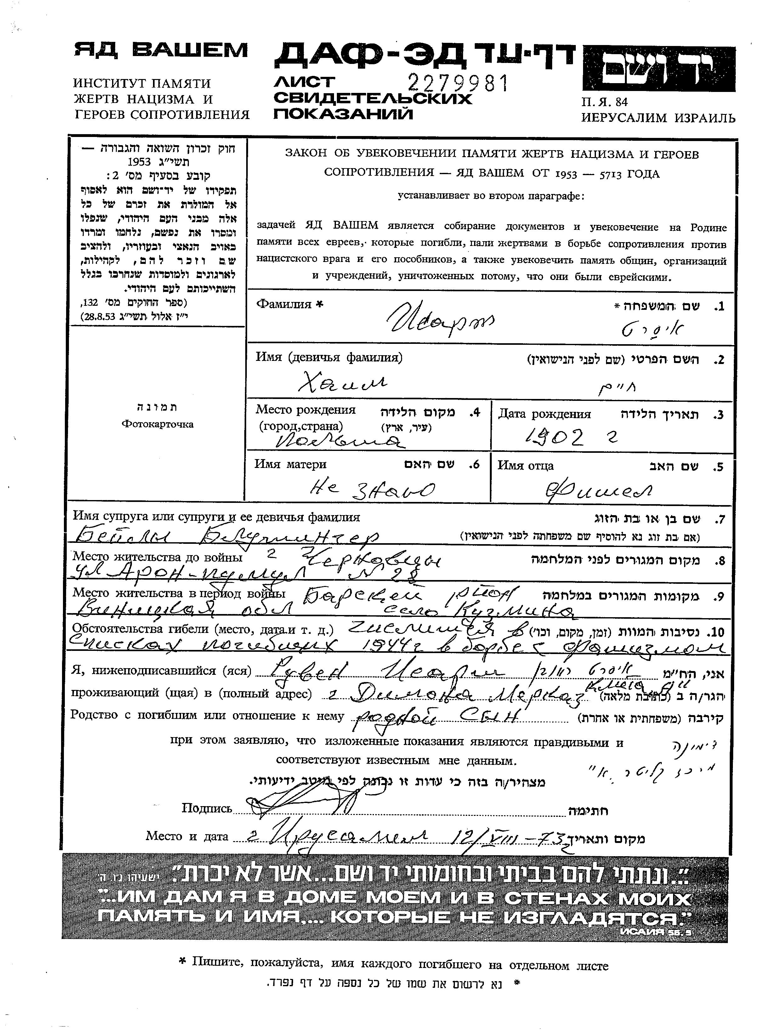Khaim Isart wurde im Jahr 1902 in Polen geboren. Er war der Sohn von Fishel. Er war mit Beila Verheiratet. Vor dem Zweiten Weltkrieg lebte er in Czernowitz, Rumänien. Während des Krieges war er in Kuzmintsy, Ukraine (UdSSR).