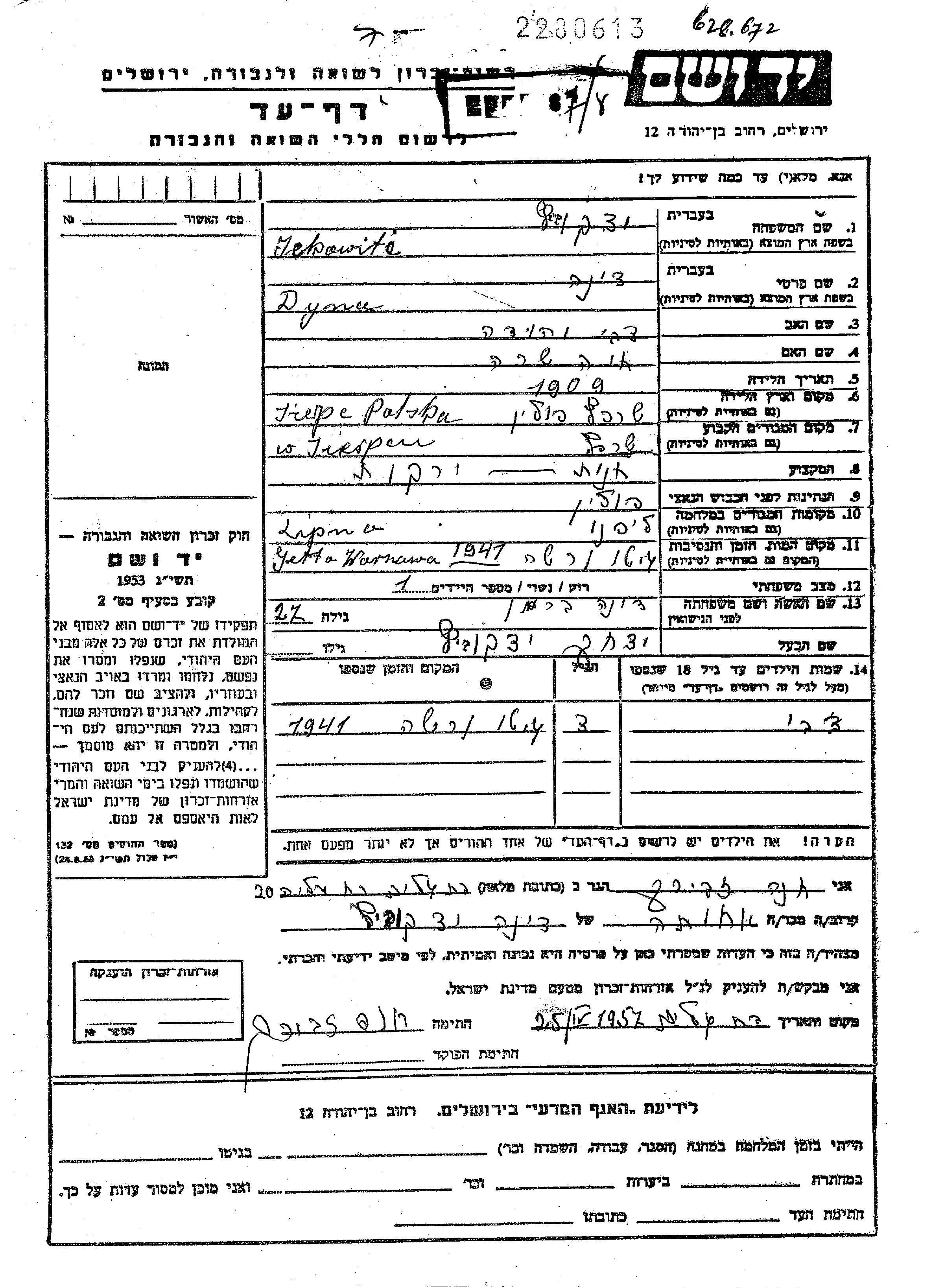 Dyna Ickowits, geb. Berman wurde im Jahr 1909 in Sierpc, Polen geboren. Sie war die Tochter von Tzvi Yehuda und Khaia Sara. Sie war Ladenbesitzer/-in und mit Ytzkhak Verheiratet. Vor dem Zweiten Weltkrieg lebte sie in Sierpc, Polen. Während des Krieges war sie in Lipno, Polen.