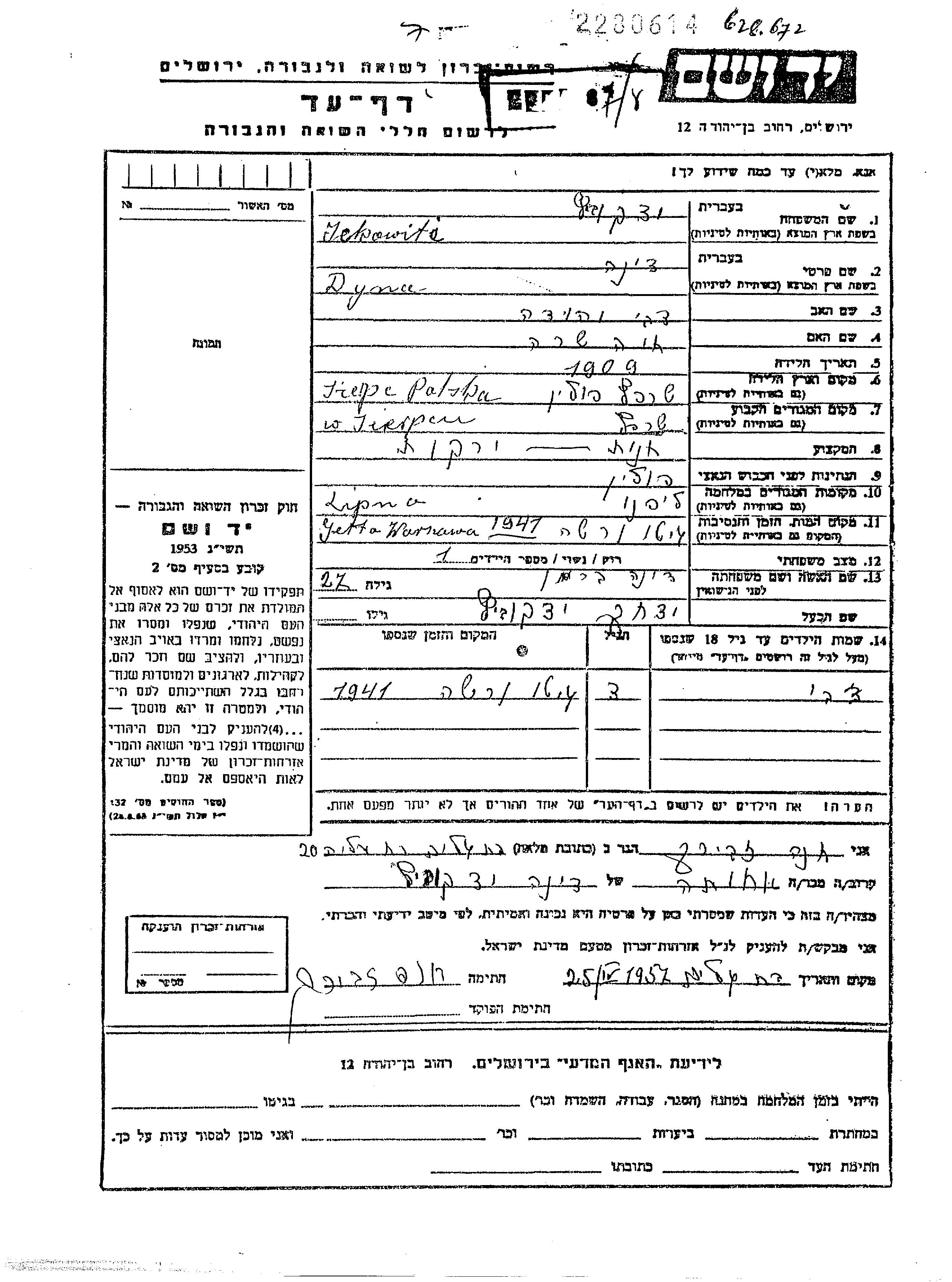 Tzvi wurde in der Schoah ermordet. Todesort: Warszawa, Polen im Jahr 1941.