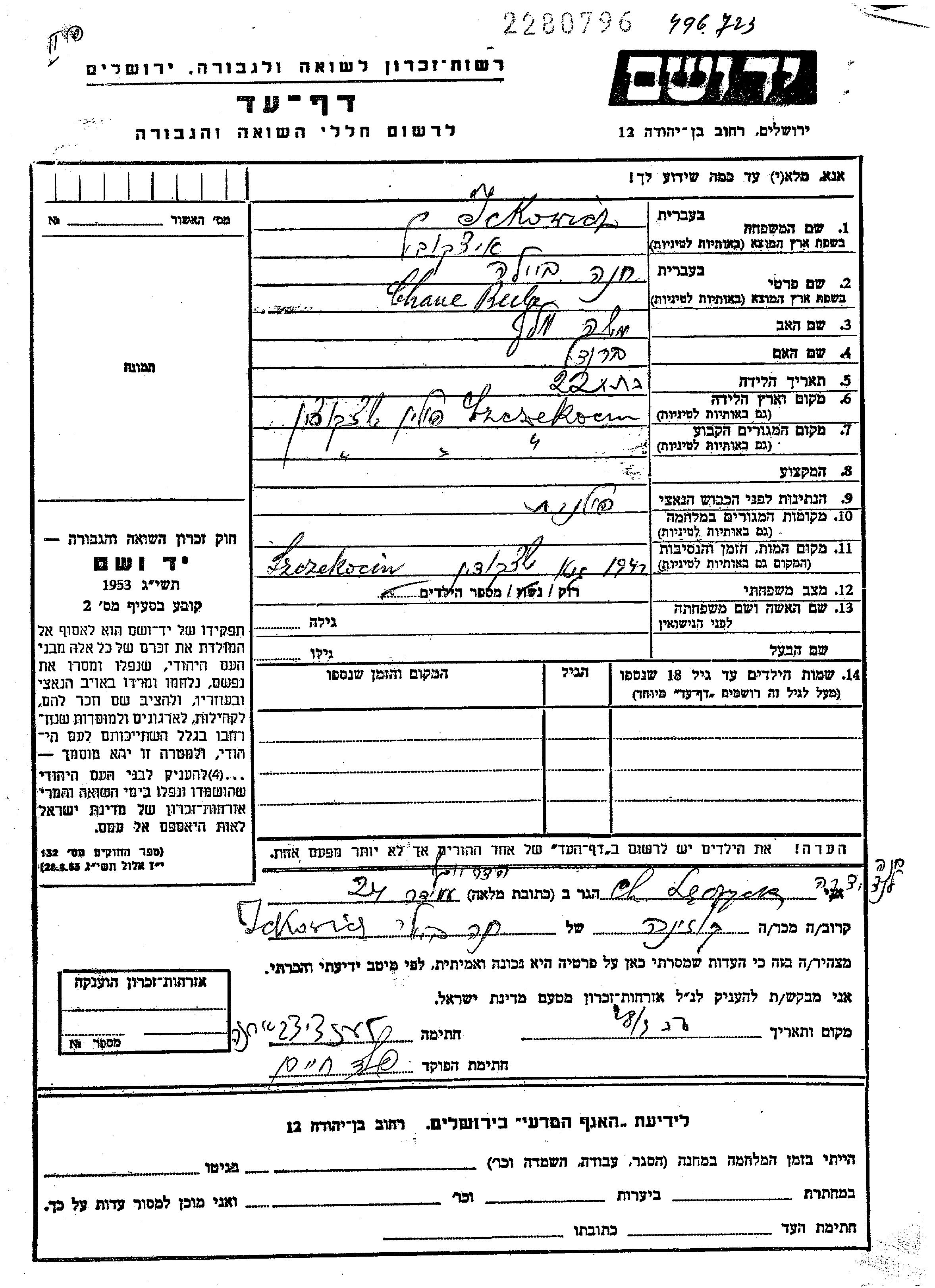 Chane wurde in der Schoah ermordet. Todesort: Szczekociny, Polen im Jahr 1942.