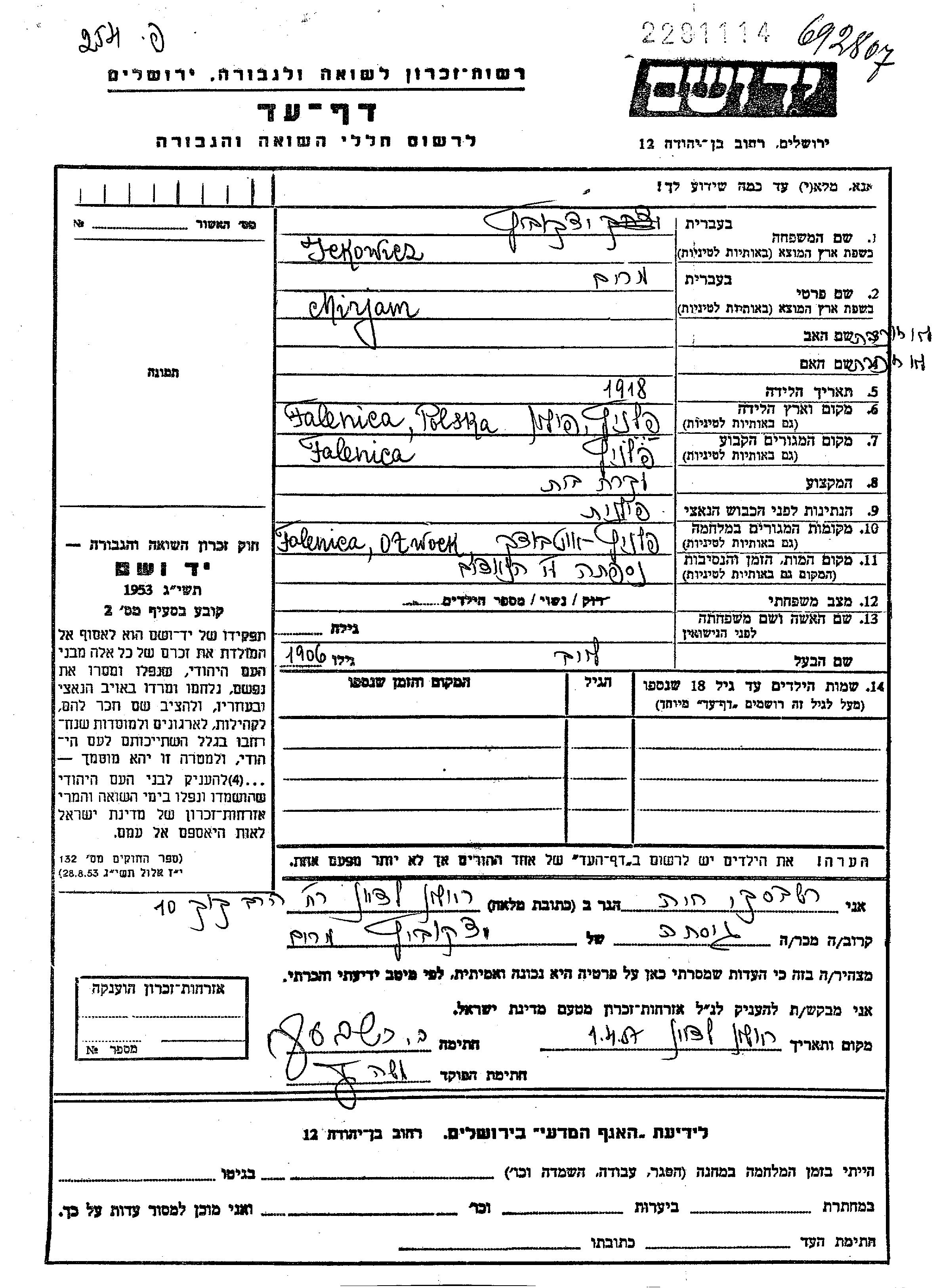 Ickowicz Mirjam 1918 Falenica, Polen Gedenkblatt