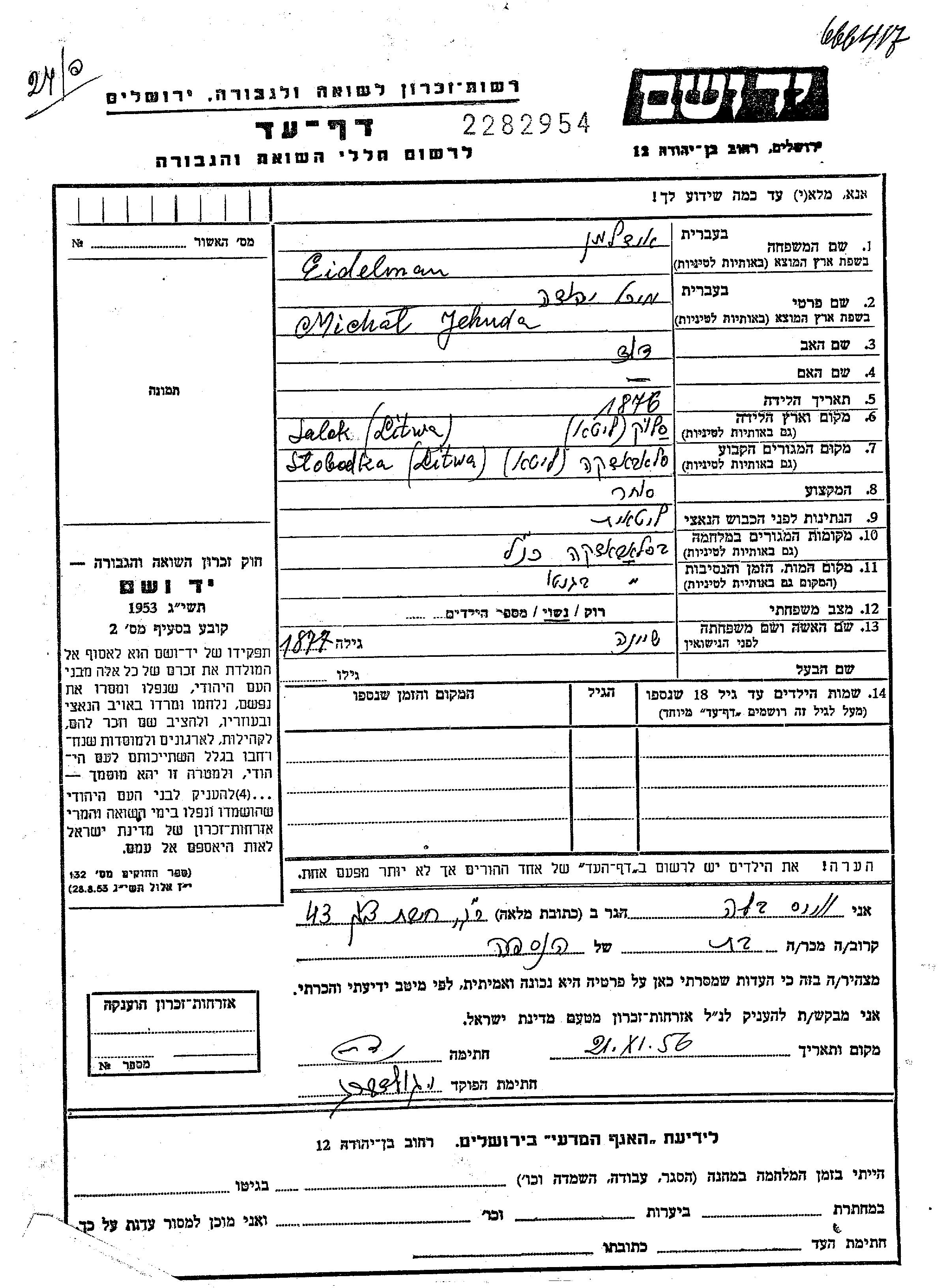 Michal Jehuda Mikhal Eidelman Idelman wurde im Jahr 1876 in Salok, Litauen geboren. Er war der Sohn von David. Er war Kaufmann/-frau und mit Szajna Verheiratet. Vor dem Zweiten Weltkrieg lebte er in Slobodka, Litauen. Während des Krieges war er in Slobodka, Litauen.