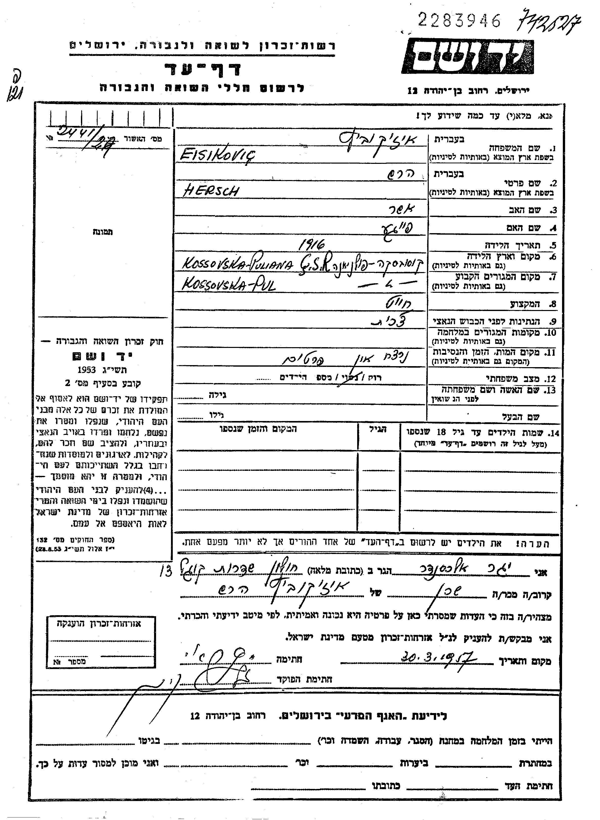 Hersch Eisikovic wurde im Jahr 1916 in Kosovskaya Polyana, Tschechoslowakei geboren. Er war der Sohn von Ascher und Feiga. Er war Schneider und Verheiratet. Vor dem Zweiten Weltkrieg lebte er in Kosovskaya Polyana, Tschechoslowakei.
