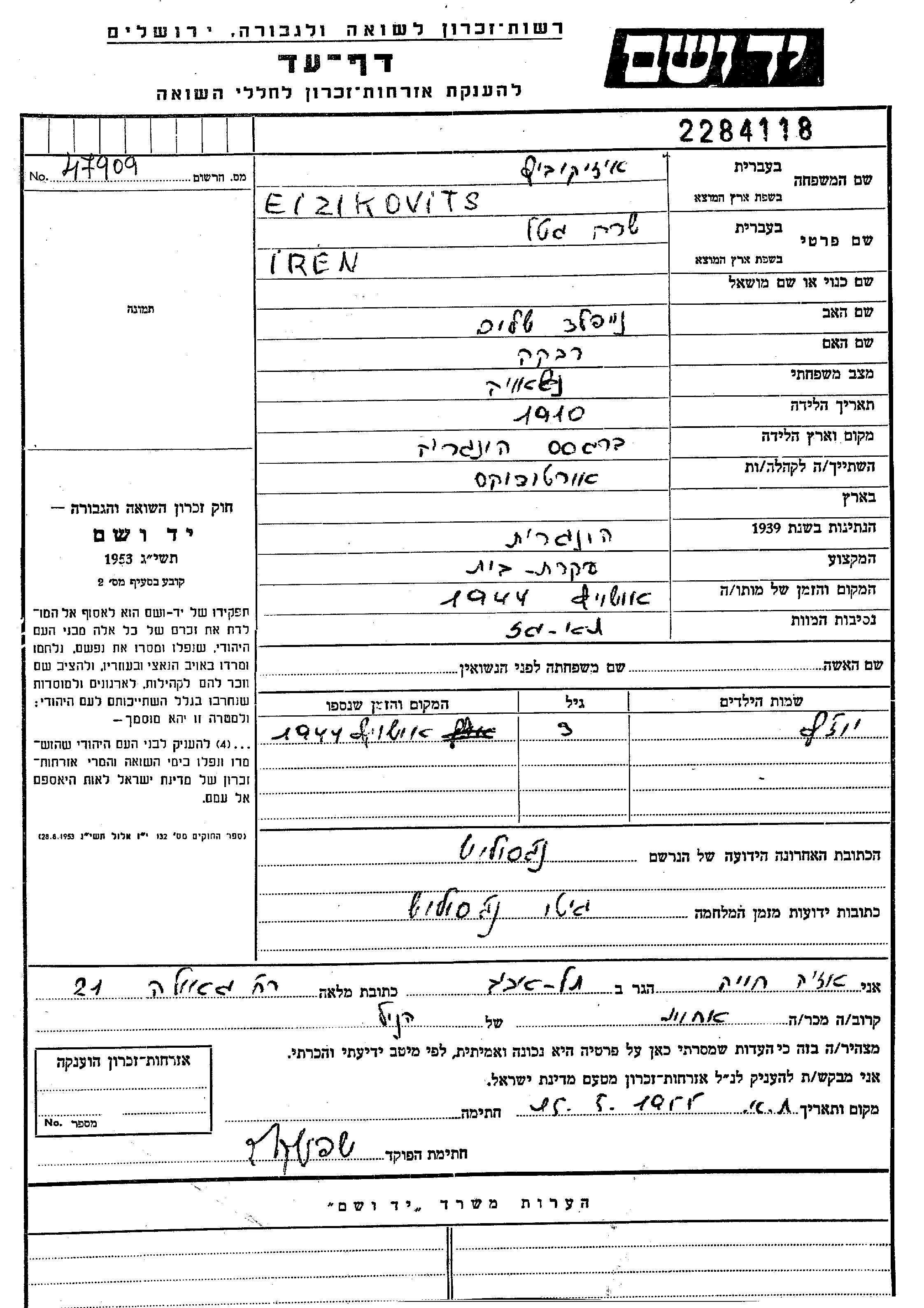 Gitl Iren Sara Eizikovits, geb. Neifeld wurde im Jahr 1910 in Beregszasz, Tschechoslowakei geboren. Sie war die Tochter von Shalom und Rivka. Sie war Hausfrau und Verheiratet. Vor dem Zweiten Weltkrieg lebte sie in Nagyszollos, Tschechoslowakei. Während des Krieges war sie in Nagyszollos, Tschechoslowakei.