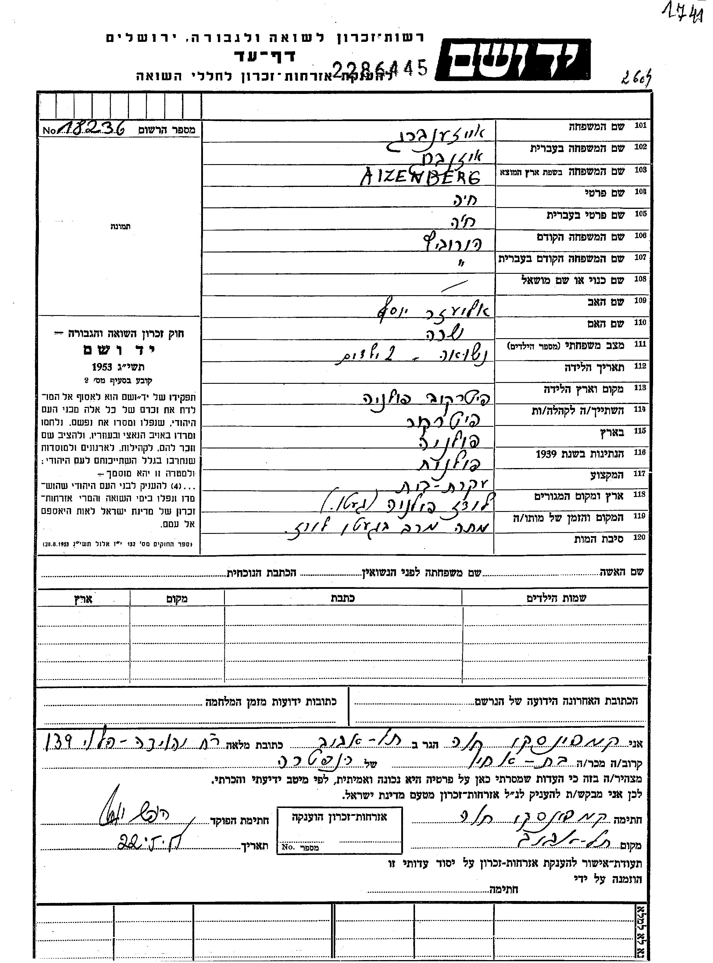Khaia Aizenberg, geb. Horovitz wurde in Piotrkow Trybunalski, Polen geboren. Sie war die Tochter von Eliezer Yosef und Sara. Sie war Hausfrau und Verheiratet. Vor dem Zweiten Weltkrieg lebte sie in Piotrkow Trybunalski, Polen.