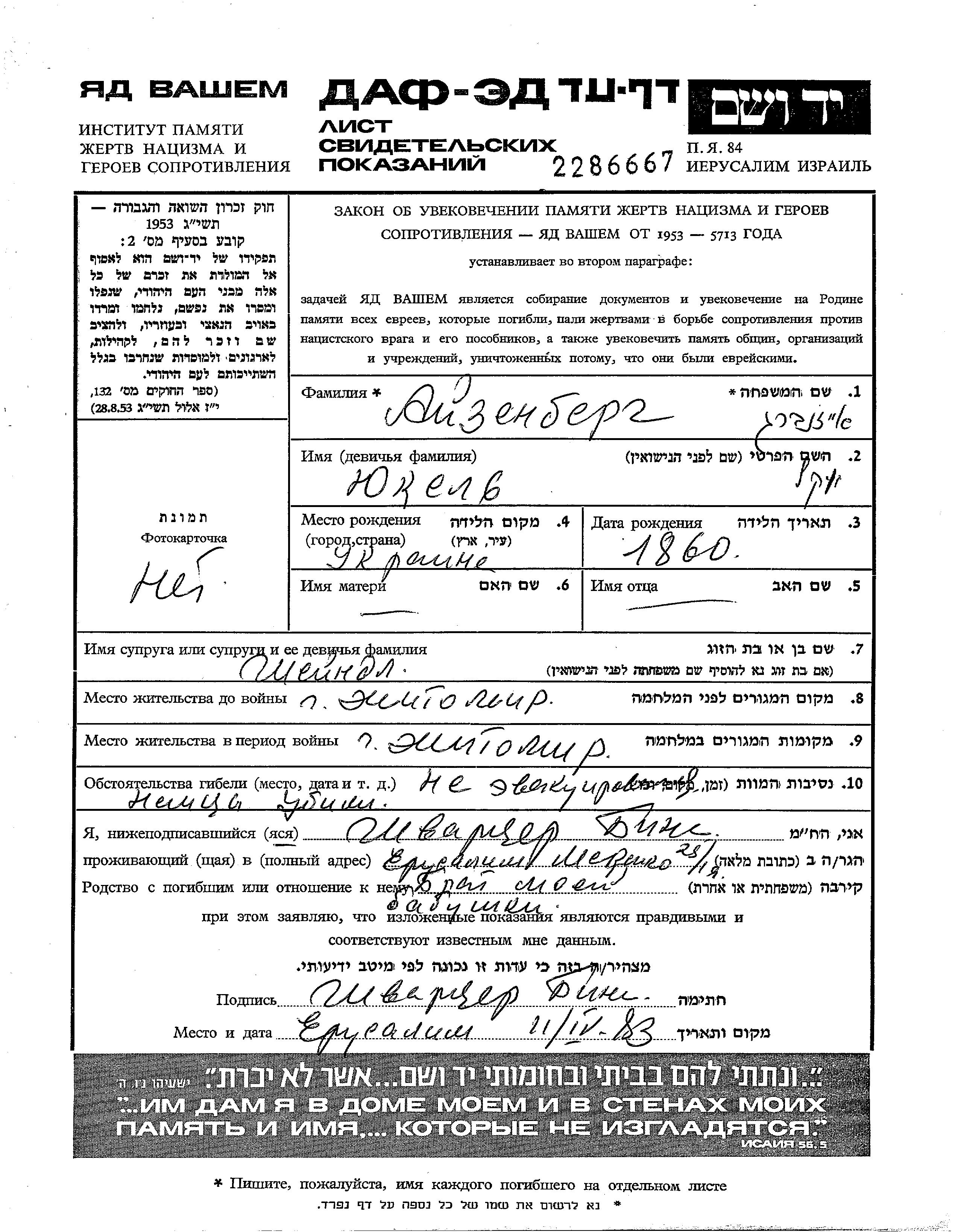 Yukel Aizenberg wurde im Jahr 1860 in Ukraine (UdSSR) geboren. Er war mit Sheindl Verheiratet. Vor dem Zweiten Weltkrieg lebte er in Zhitomir, Ukraine (UdSSR). Während des Krieges war er in Zhitomir, Ukraine (UdSSR).