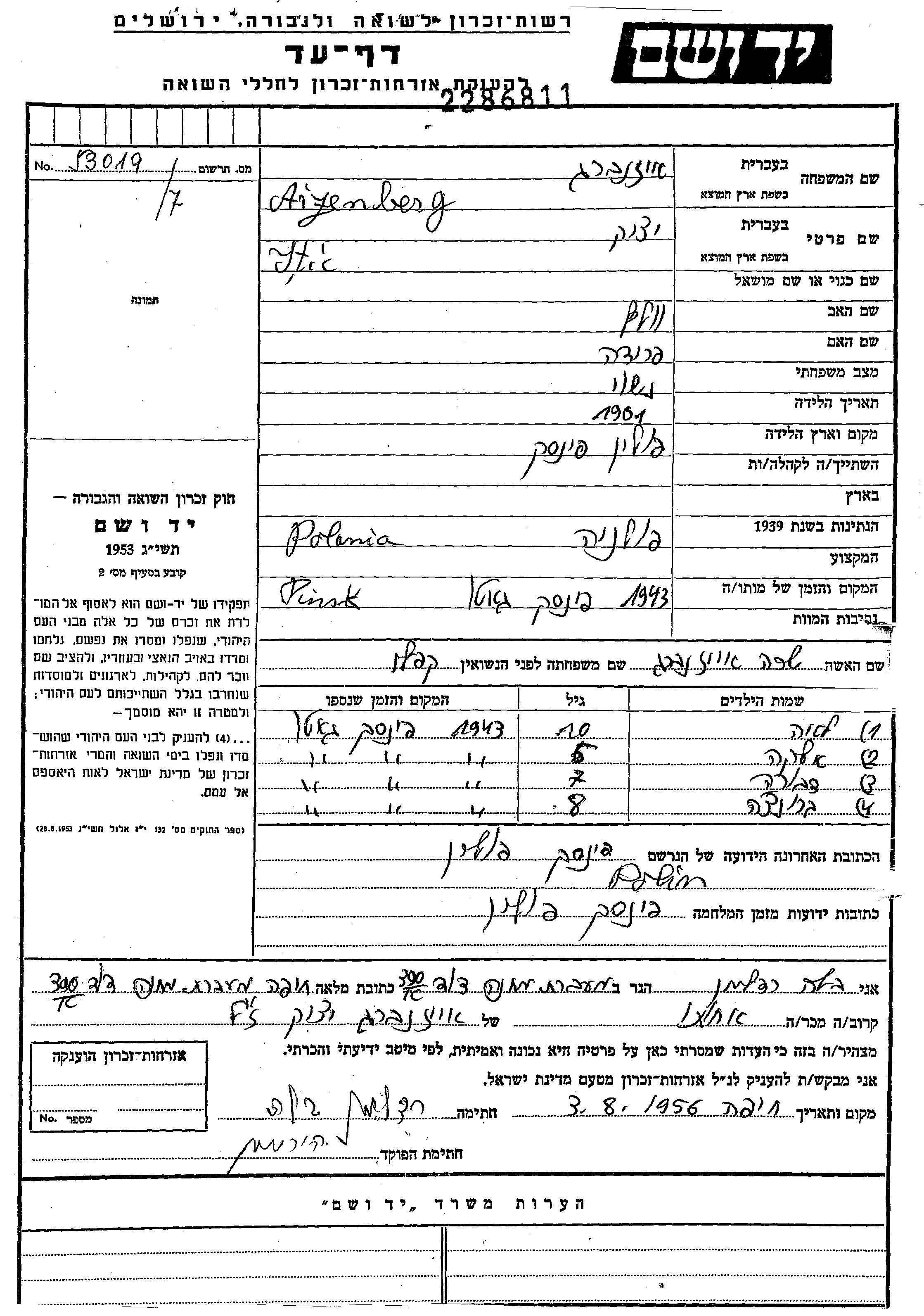 Itic wurde in der Schoah ermordet. Todesort: Pinsk, Polen im Jahr 1943.