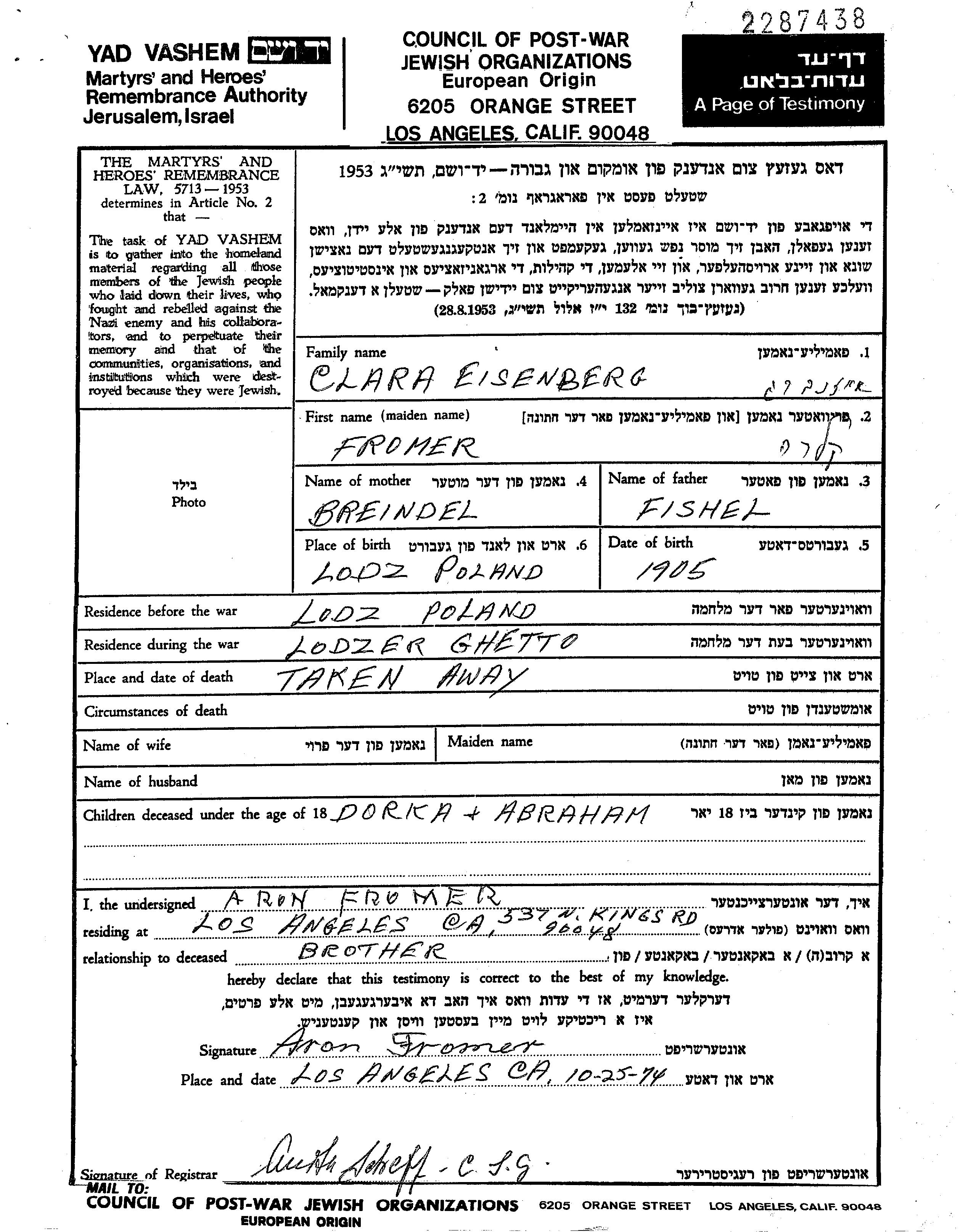 Clara Eisenberg, geb. Frumer wurde im Jahr 1905 in Lodz, Polen geboren. Sie war die Tochter von Fishel und Braindel. Vor dem Zweiten Weltkrieg lebte sie in Lodz, Polen. Während des Krieges war sie in Lodz, Polen.