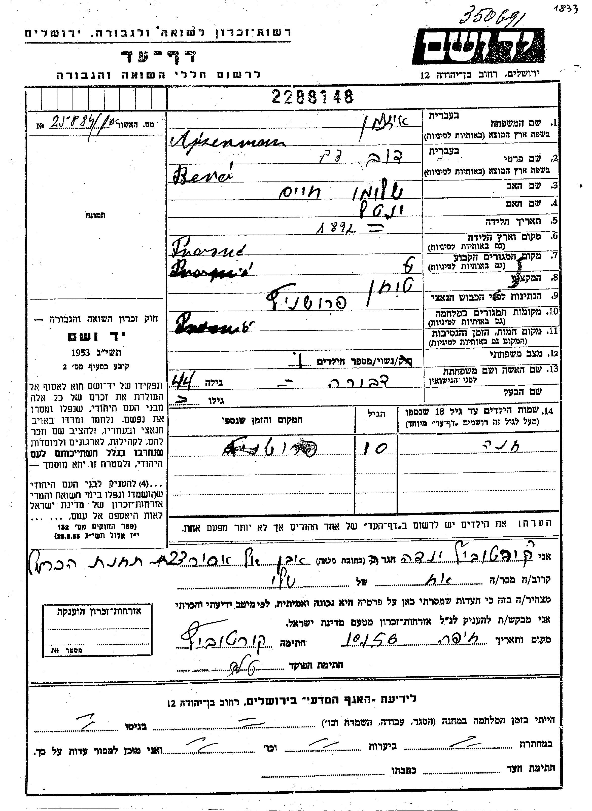 Dov Berei Ajzenman wurde im Jahr 1892 in Proshnitz, Polen geboren. Er war der Sohn von Shlomo Khaim und Yentl. Er war Getreidemüller/-in und mit Dvora Verheiratet. Vor dem Zweiten Weltkrieg lebte er in Proshnitz, Polen. Während des Krieges war er in Proshnitz, Polen.