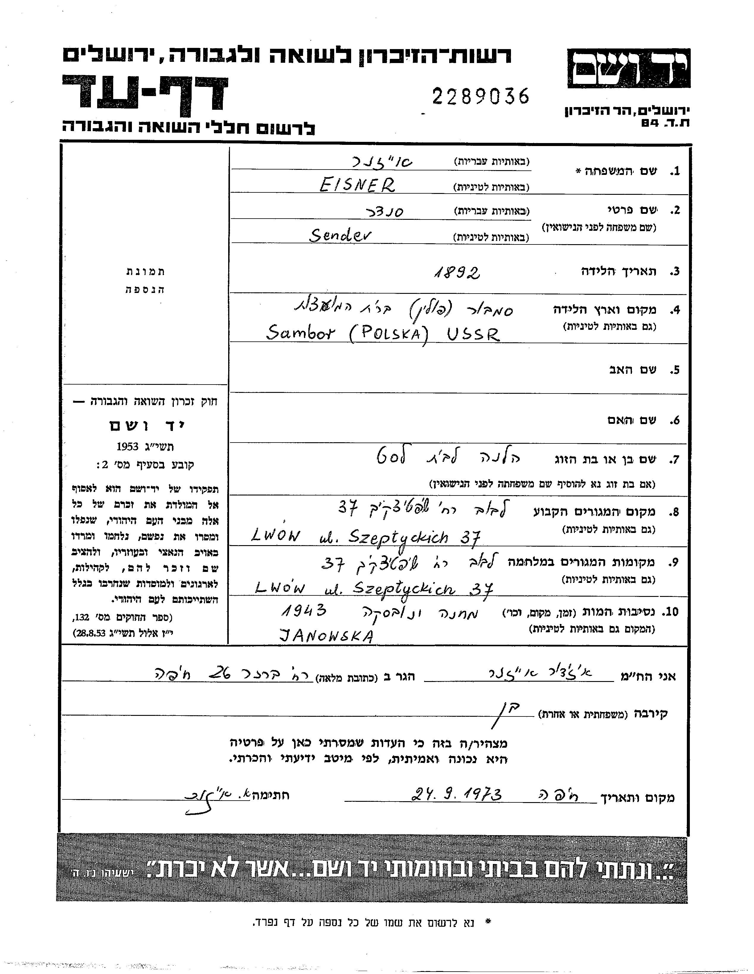 Sender Eisner wurde im Jahr 1892 in Sambor, Polen geboren. Er war mit Helena Verheiratet. Vor dem Zweiten Weltkrieg lebte er in Lwow, Polen. Während des Krieges war er in Lwow, Polen.