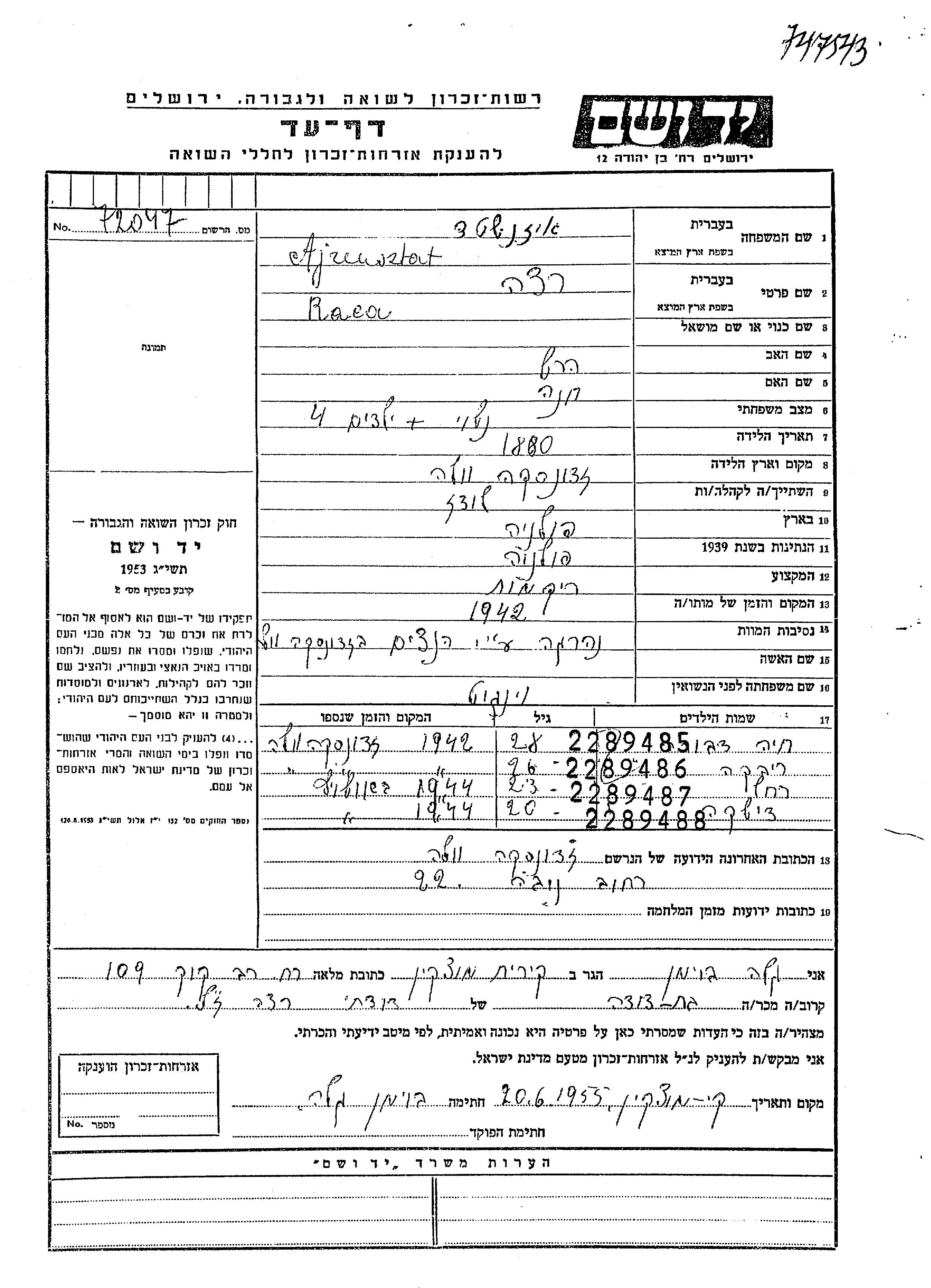 Ajzensztat Dvora Khaia 1914 Lodz, Polen Gedenkblatt