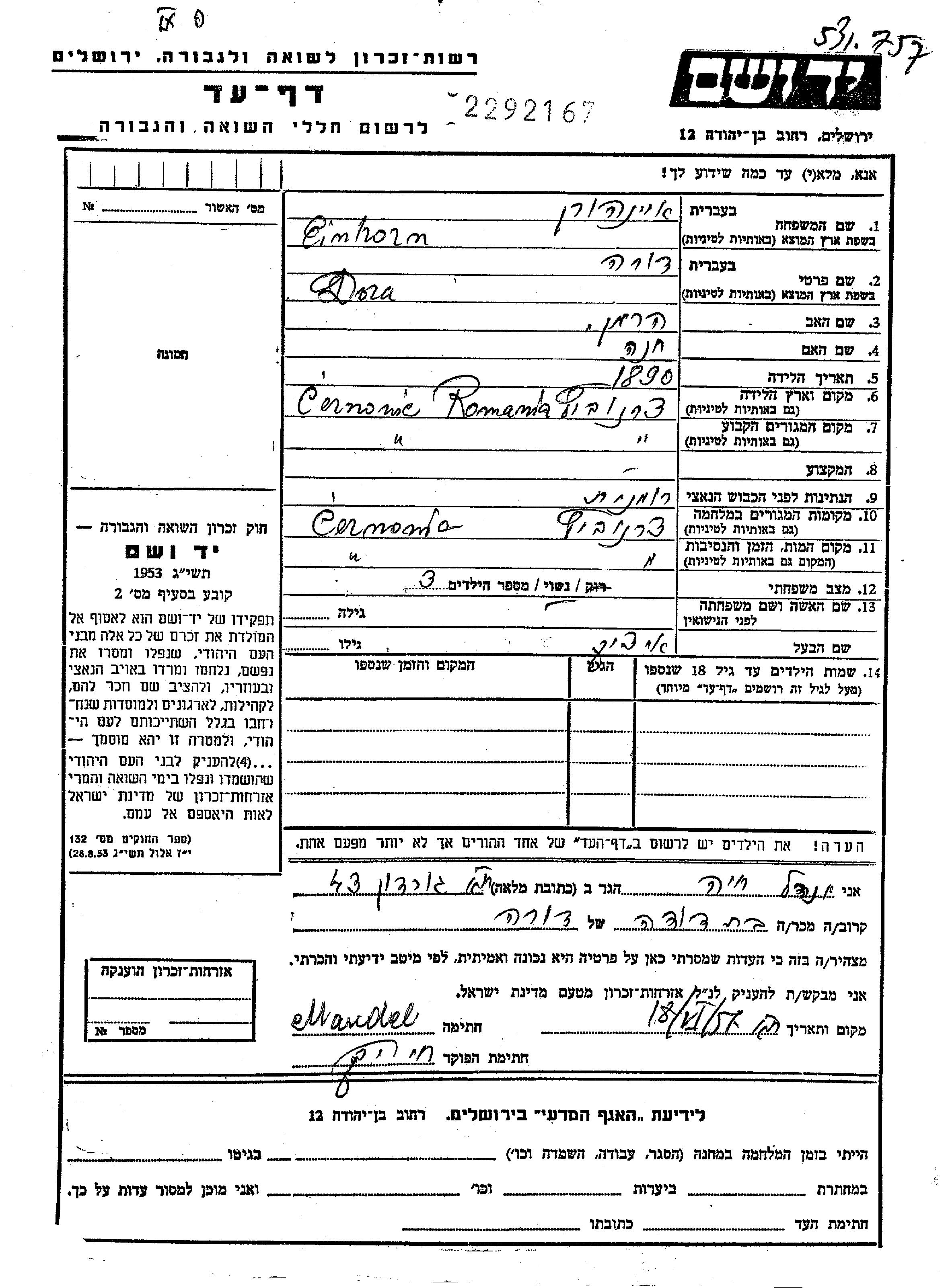 Dora Einhorn, geb. Tzvibel wurde im Jahr 1890 in Czernowitz, Rumänien geboren. Sie war die Tochter von Herman und Khana. Sie war mit Icyk Verheiratet. Vor dem Zweiten Weltkrieg lebte sie in Czernowitz, Rumänien. Während des Krieges war sie in Czernowitz, Rumänien.