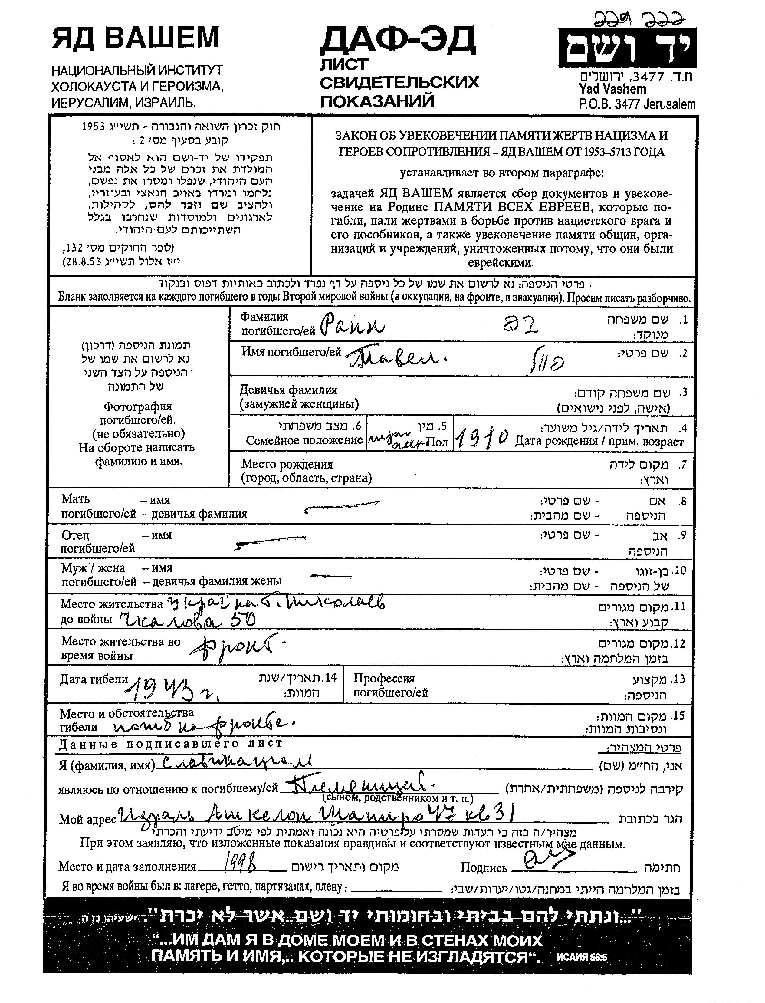 Pavel Rain wurde im Jahr 1910 geboren. Er war Verheiratet. Vor dem Zweiten Weltkrieg lebte er in Nikolayev, Ukraine (UdSSR). Während des Krieges war er in die Sowjetischen Streitkräfte. Pavel im Militärdienst umgekommen. Todesort: unbekannt im Jahr 1943.