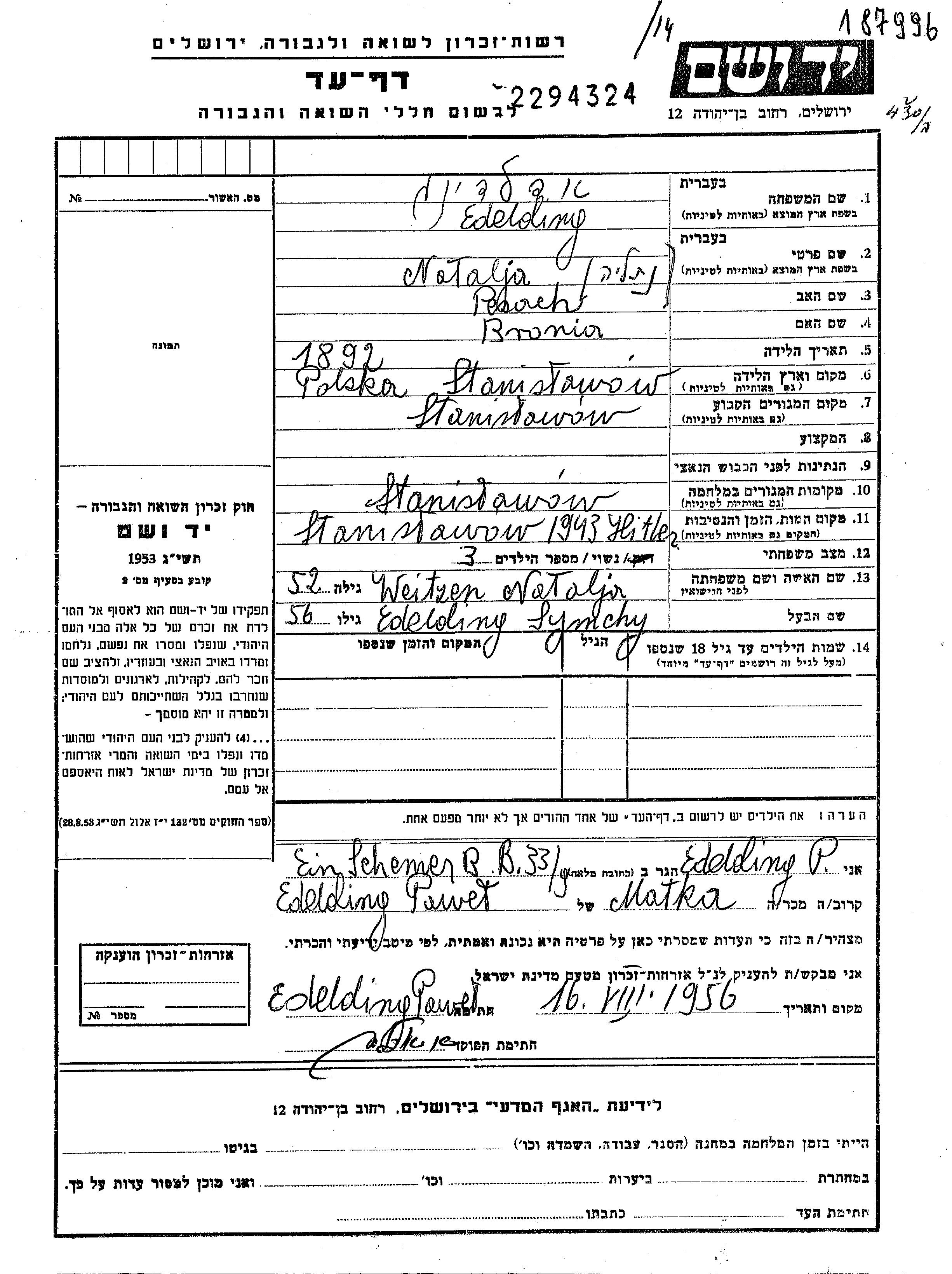 Natalja Edelding, geb. Weitzen wurde im Jahr 1892 in Stanislawow, Polen geboren. Sie war die Tochter von Pesach und Bronia. Sie war mit Symchy Verheiratet. Vor dem Zweiten Weltkrieg lebte sie in Stanislawow, Polen. Während des Krieges war sie in Stanislawow, Polen.