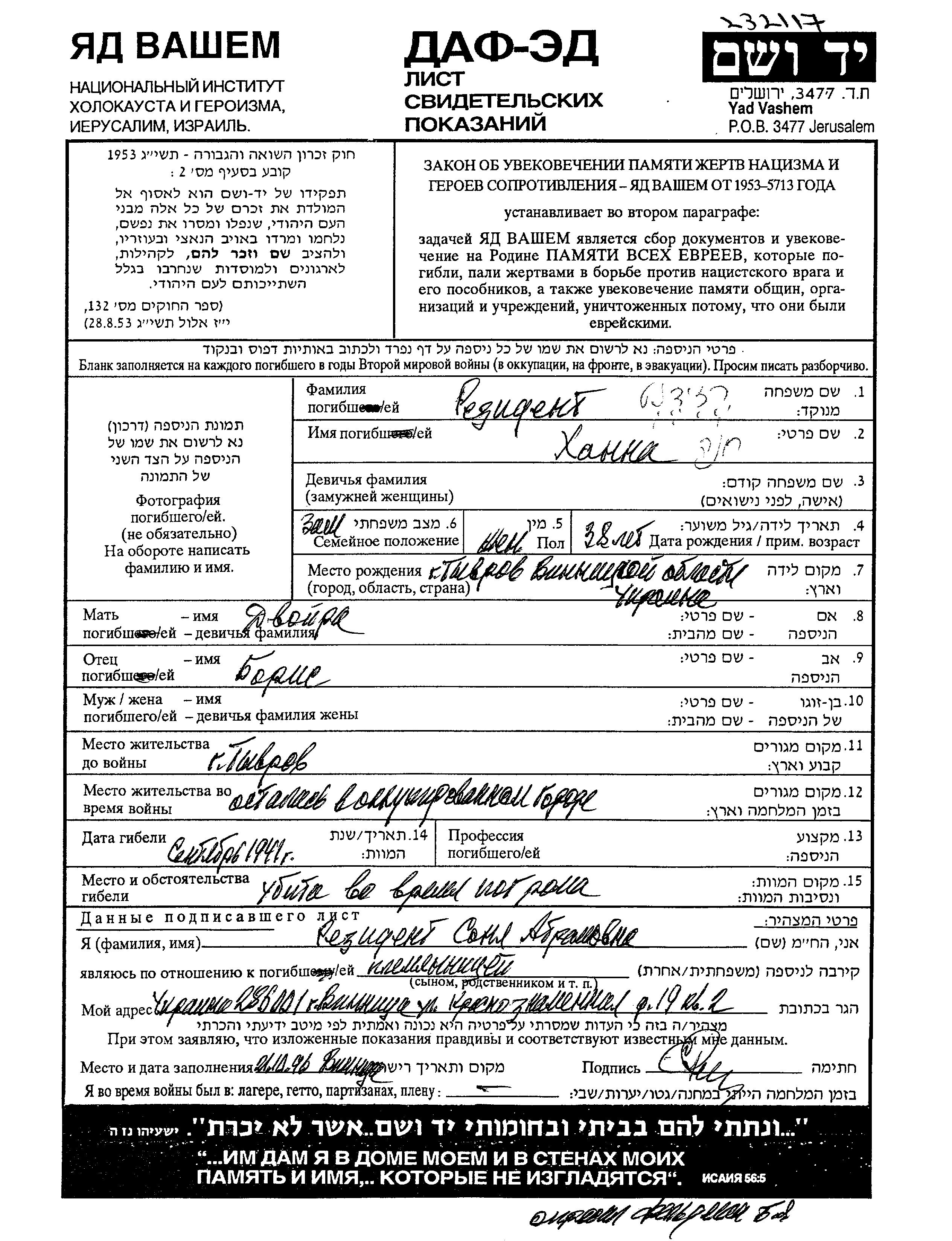 Khana Rezident wurde im Jahr 1903 in Tyvrov, Ukraine (UdSSR) geboren. Sie war die Tochter von Boris und Dvoira. Sie war Verheiratet. Vor dem Zweiten Weltkrieg lebte sie in Tyvrov, Ukraine (UdSSR). Während des Krieges war sie in Tyvrov, Ukraine (UdSSR).