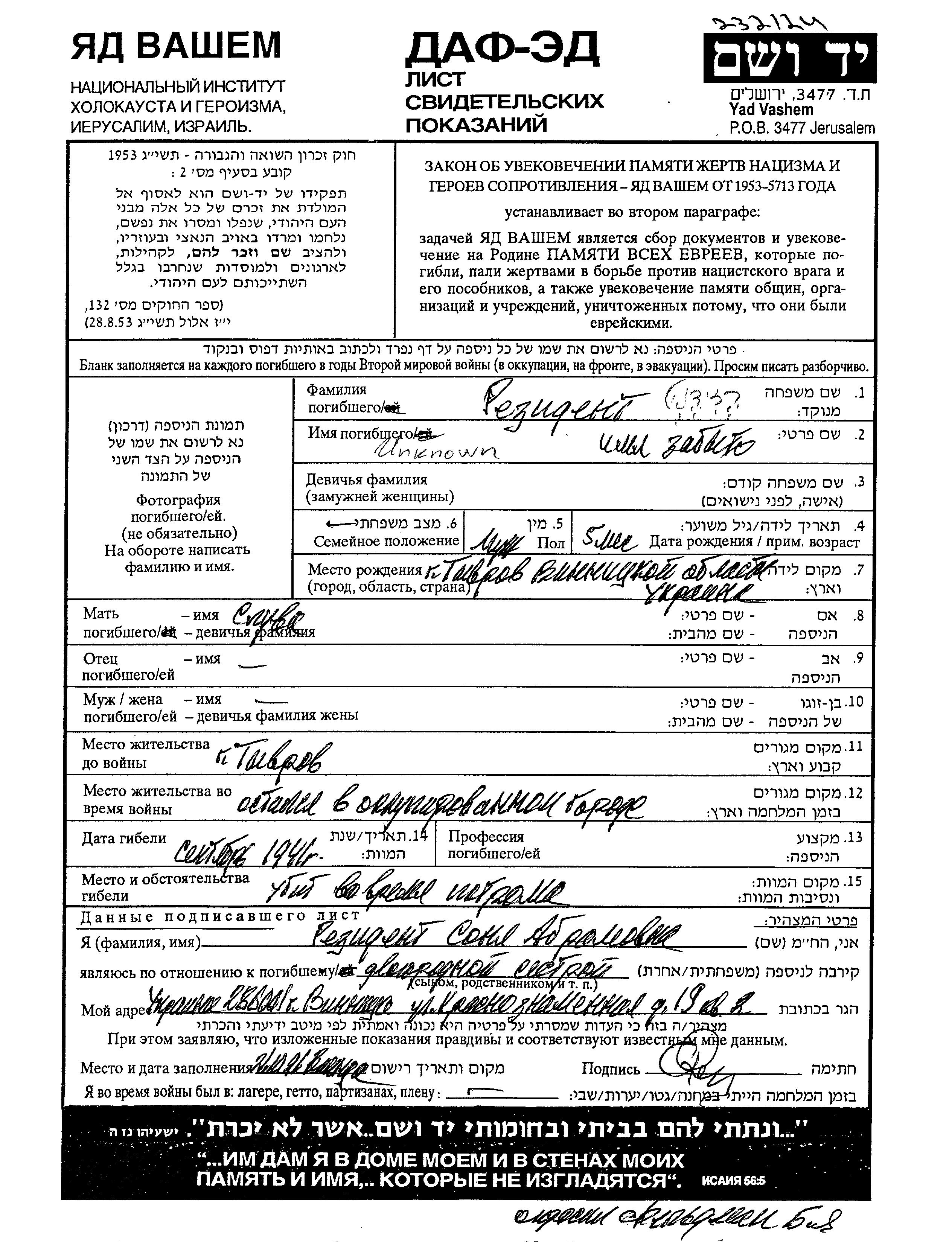 Vorname unbekannt Rezident wurde im Jahr 1941 in Tyvrov, Ukraine (UdSSR) geboren. Er war der Sohn von Sluva. Er war Kind. Vor dem Zweiten Weltkrieg lebte er in Tyvrov, Ukraine (UdSSR). Während des Krieges war er in Tyvrov, Ukraine (UdSSR).