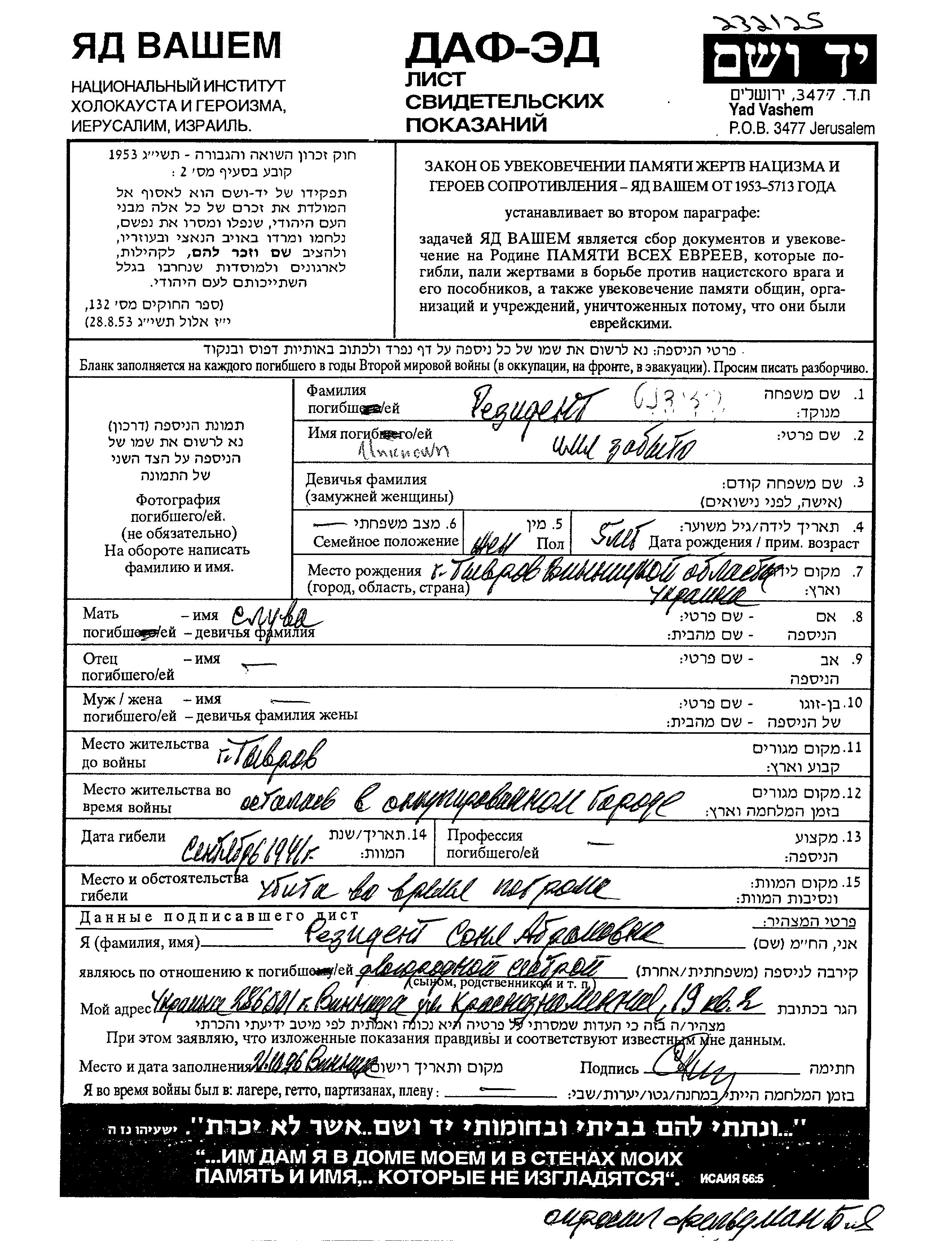 Vorname unbekannt Rezident wurde im Jahr 1936 in Tyvrov, Ukraine (UdSSR) geboren. Sie war die Tochter von Sluva. Sie war Kind. Vor dem Zweiten Weltkrieg lebte sie in Tyvrov, Ukraine (UdSSR). Während des Krieges war sie in Tyvrov, Ukraine (UdSSR).