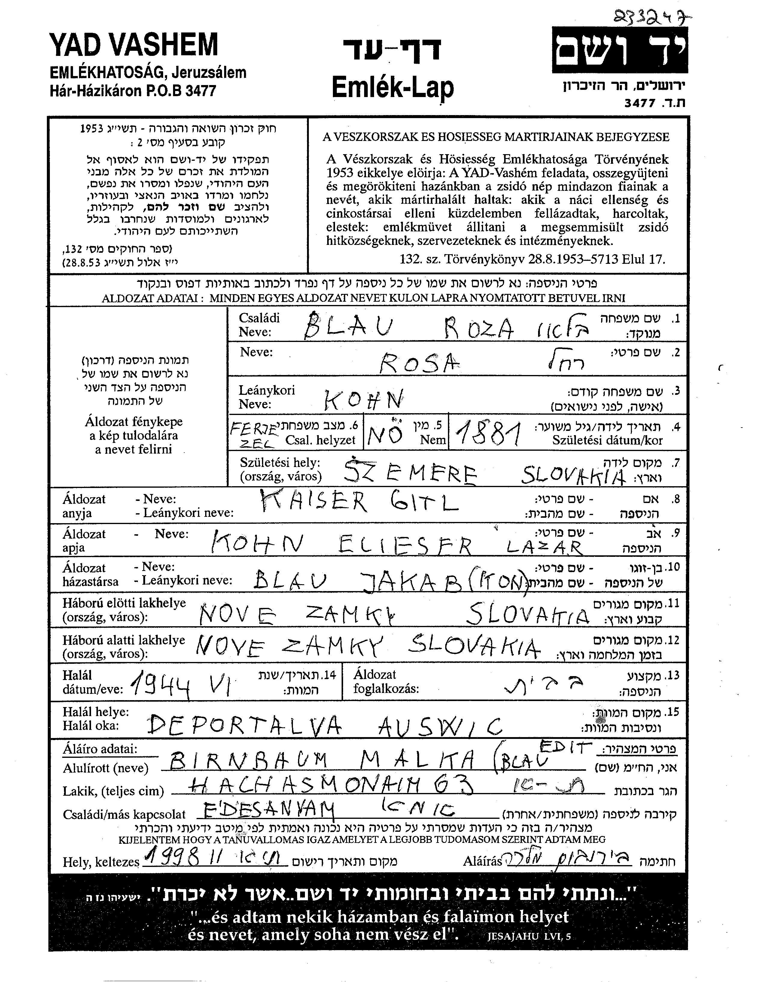 Rosa Blau, geb. Kohn Kun wurde im Jahr 1881 in Szemere, Ungarn geboren. Sie war die Tochter von Elieser und Gitl, geb. Kaiser. Sie war Hausfrau und mit Rosa Verheiratet. Vor dem Zweiten Weltkrieg lebte sie in Nove Zamky, Tschechoslowakei. Während des Krieges war sie in Nove Zamky, Tschechoslowakei.
