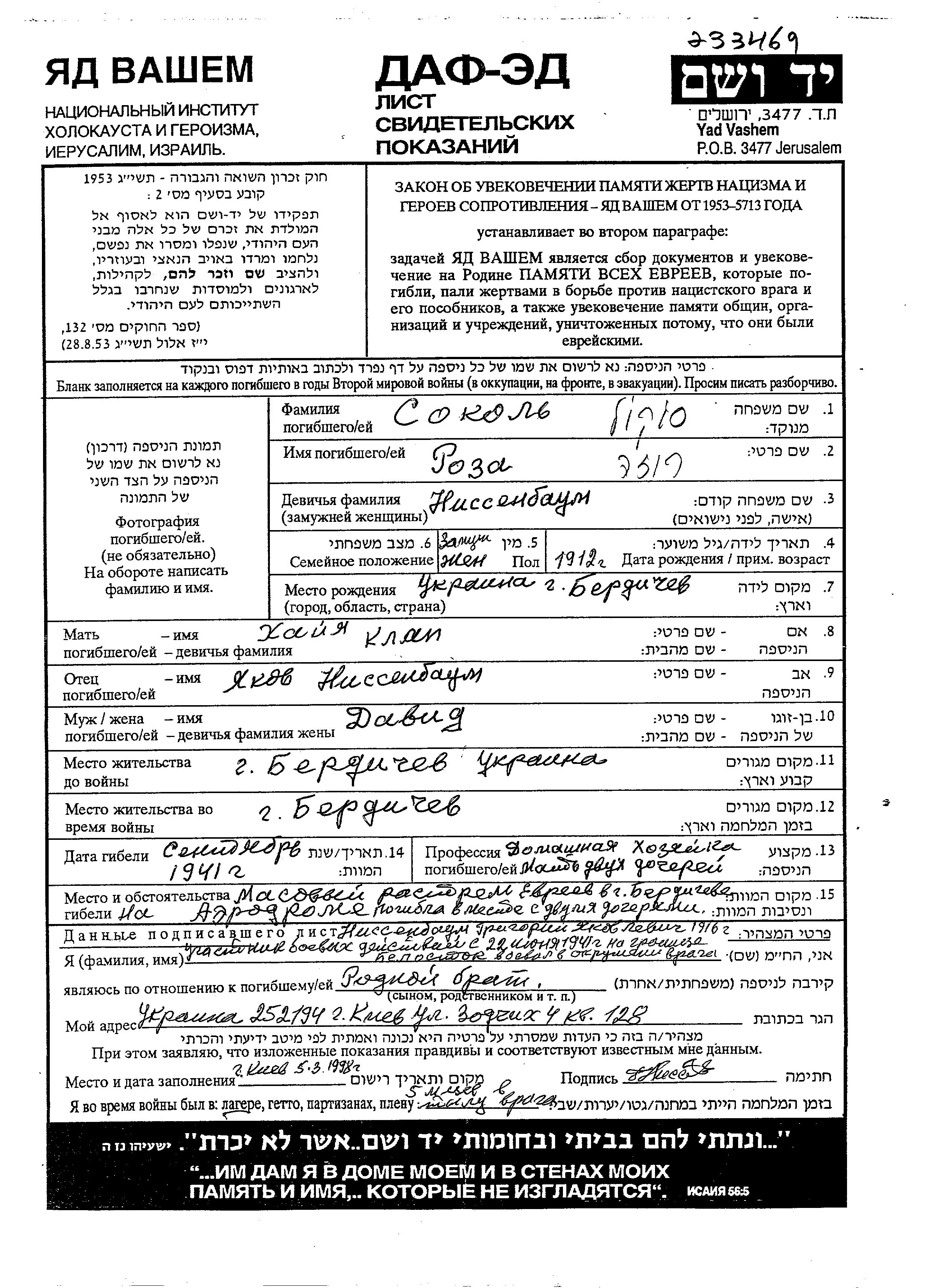 Roza Sokol, geb. Nisenbaum wurde im Jahr 1912 in Berdichev, Ukraine (UdSSR) geboren. Sie war die Tochter von Yakov und Khaia, geb. Klap. Sie war Hausfrau und mit Doda Verheiratet. Vor dem Zweiten Weltkrieg lebte sie in Berdichev, Ukraine (UdSSR). Während des Krieges war sie in Berdichev, Ukraine (UdSSR).