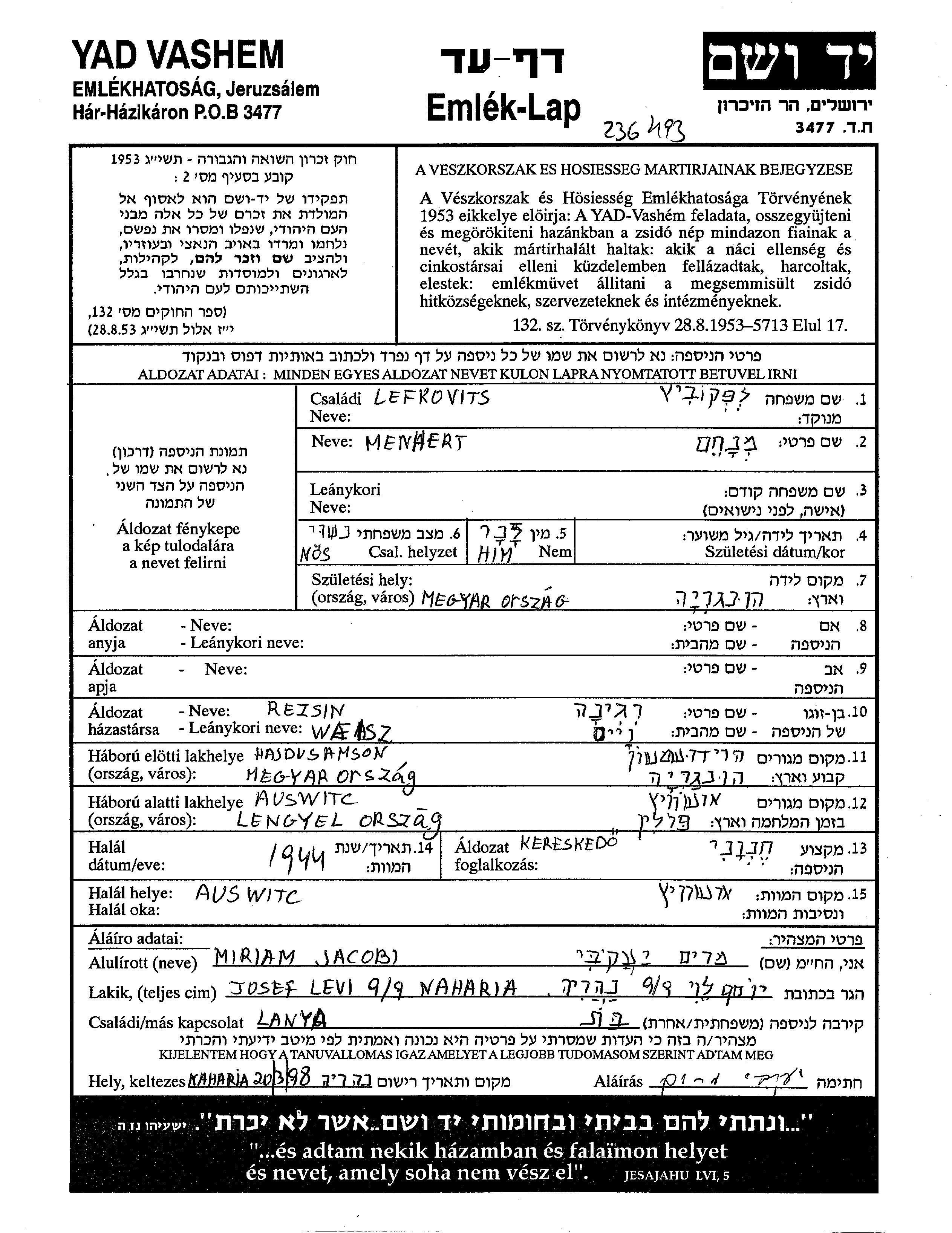 Menhert Lefkovits wurde in Ungarn geboren. Er war Ladenbesitzer/-in und mit Rezsin Rezhin Verheiratet. Vor dem Zweiten Weltkrieg lebte er in Hajdusamson, Ungarn. Während des Krieges war er in Ungarn.