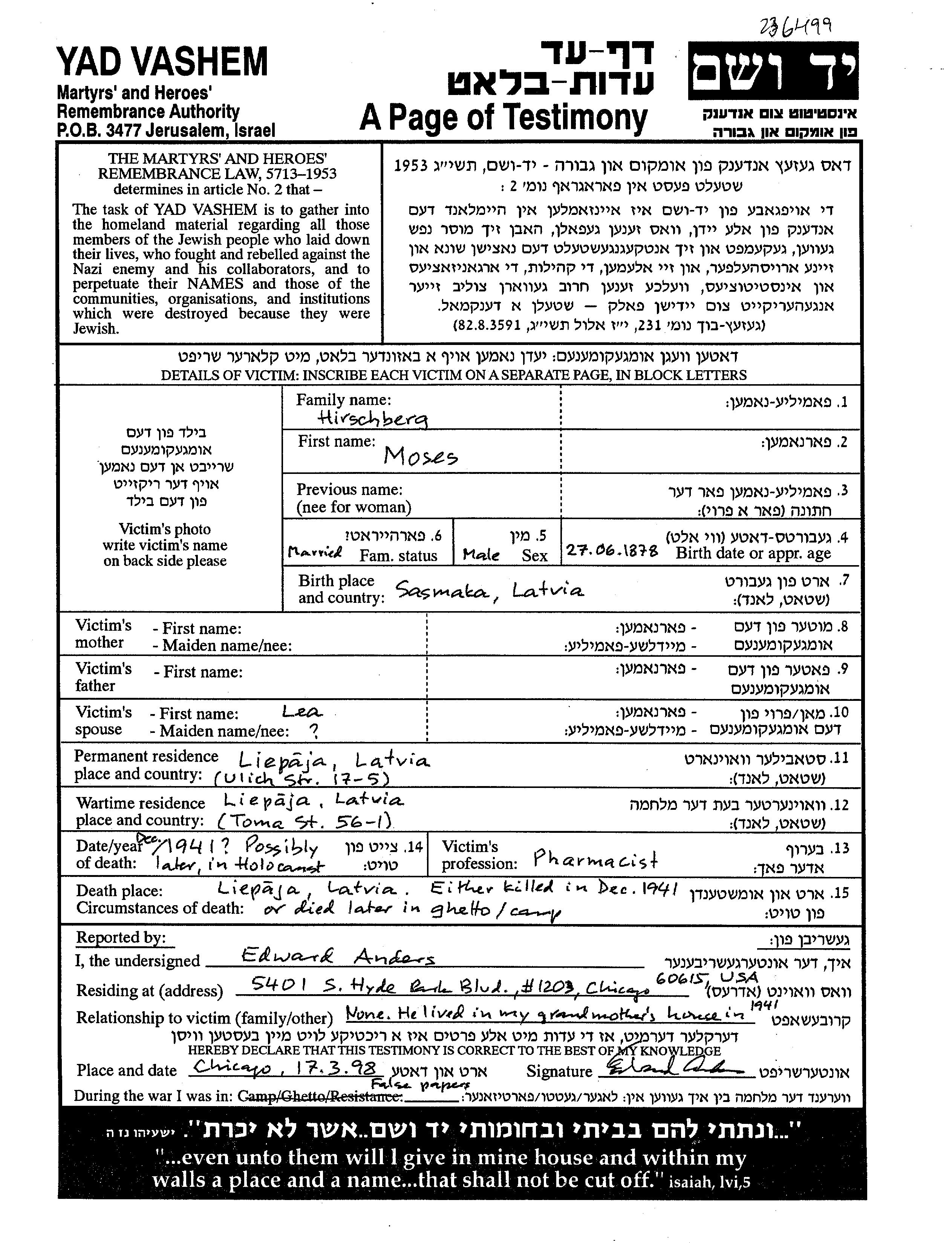Moses wurde in der Schoah ermordet. Todesort: Liepaja, Lettland im Jahr 1941.
