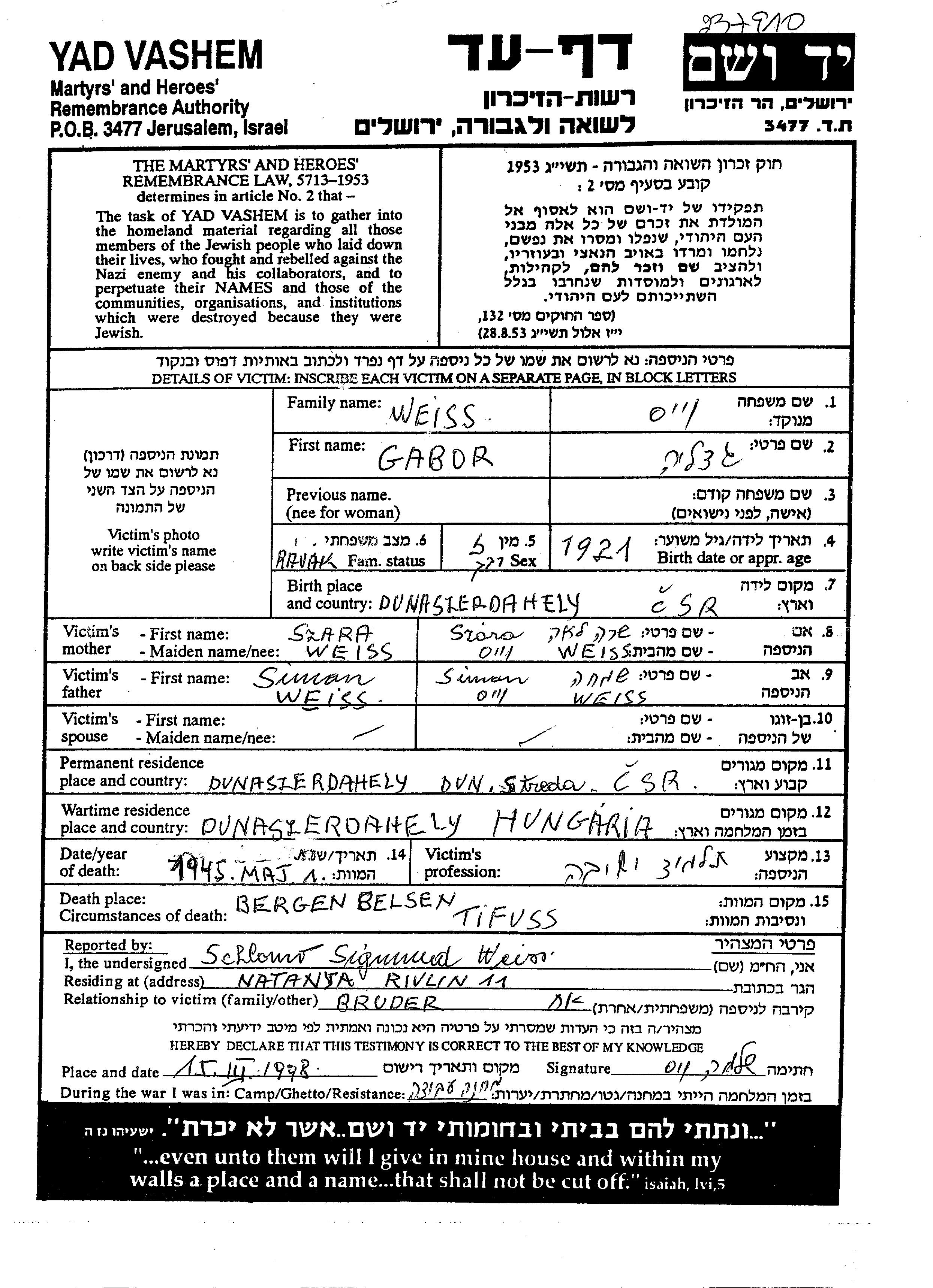 Gabor Weiss wurde im Jahr 1921 in Dunaszerdahely, Tschechoslowakei geboren. Er war der Sohn von Simon Simcha und Sara Lea, geb. Schön Shein. Er war Jeschiwahschüler und Ledig. Vor dem Zweiten Weltkrieg lebte er in Dunaszerdahely, Tschechoslowakei. Während des Krieges war er in Dunaszerdahely, Tschechoslowakei.