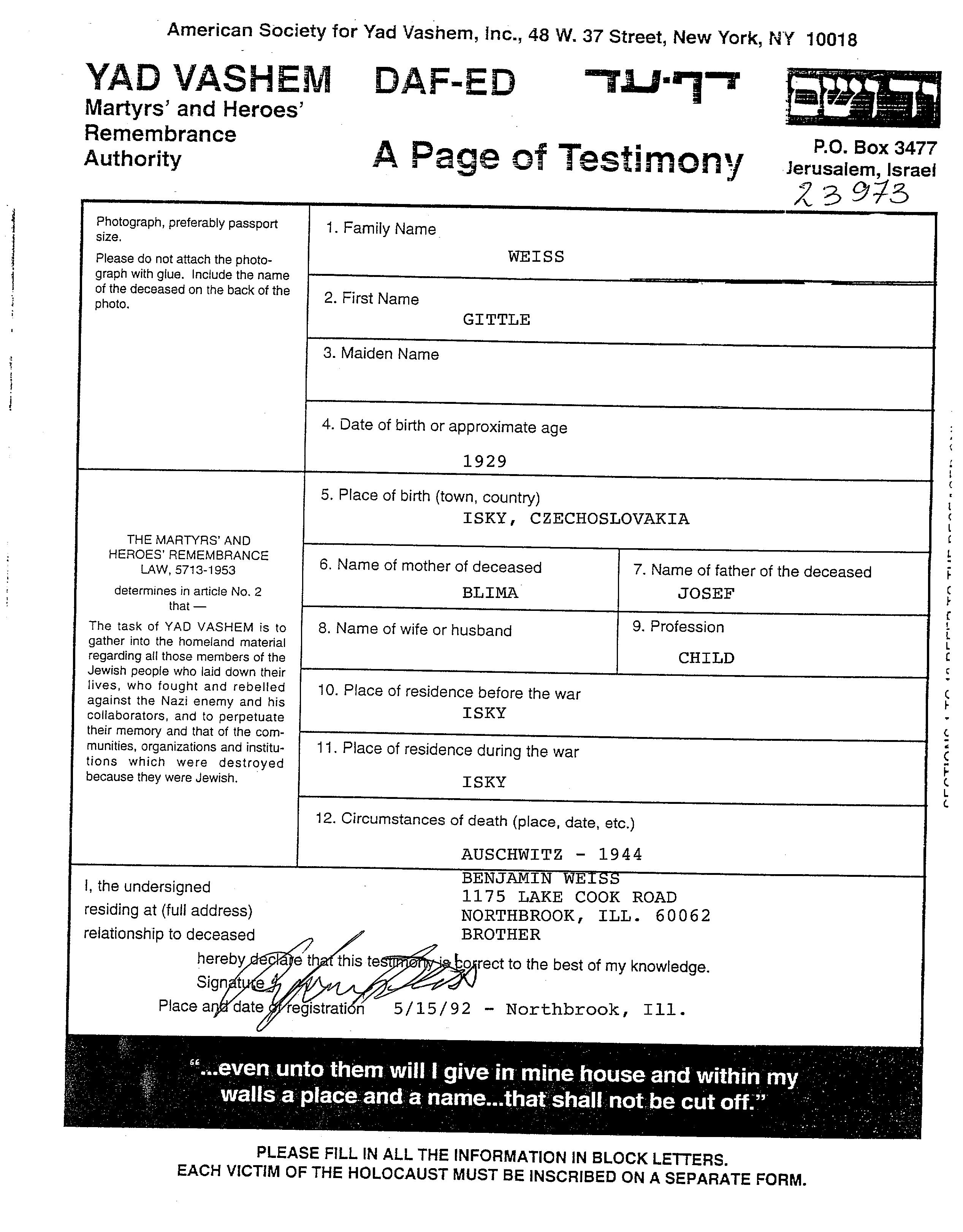 Gittle Weiss wurde im Jahr 1929 in Isky, Tschechoslowakei geboren. Sie war die Tochter von Josef und Blima, geb. Steinberg. Sie war Kind. Vor dem Zweiten Weltkrieg lebte sie in Isky, Tschechoslowakei. Während des Krieges war sie in Isky, Tschechoslowakei.