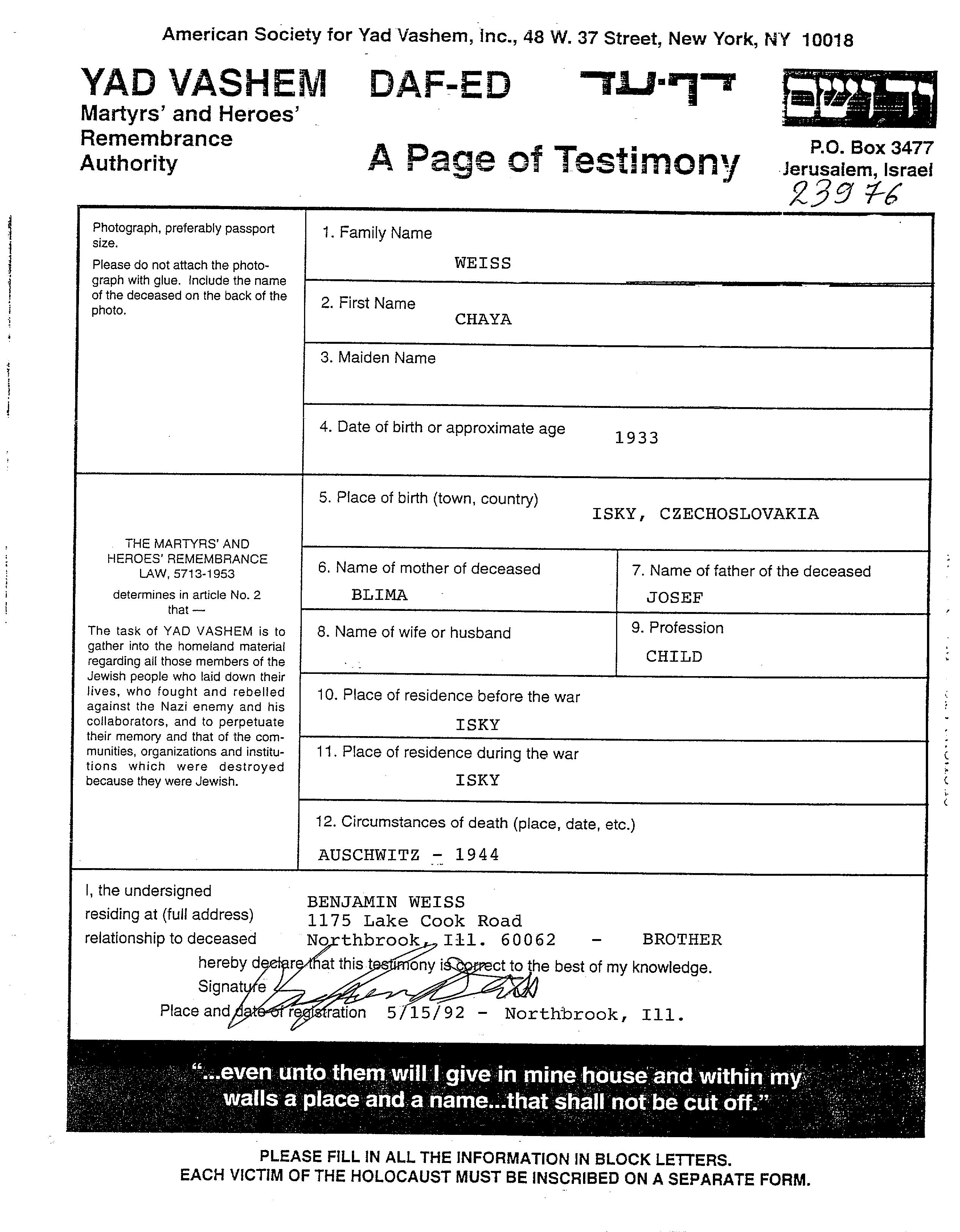 Weiss Chaya 1933 Isky, Tschechoslowakei Gedenkblatt