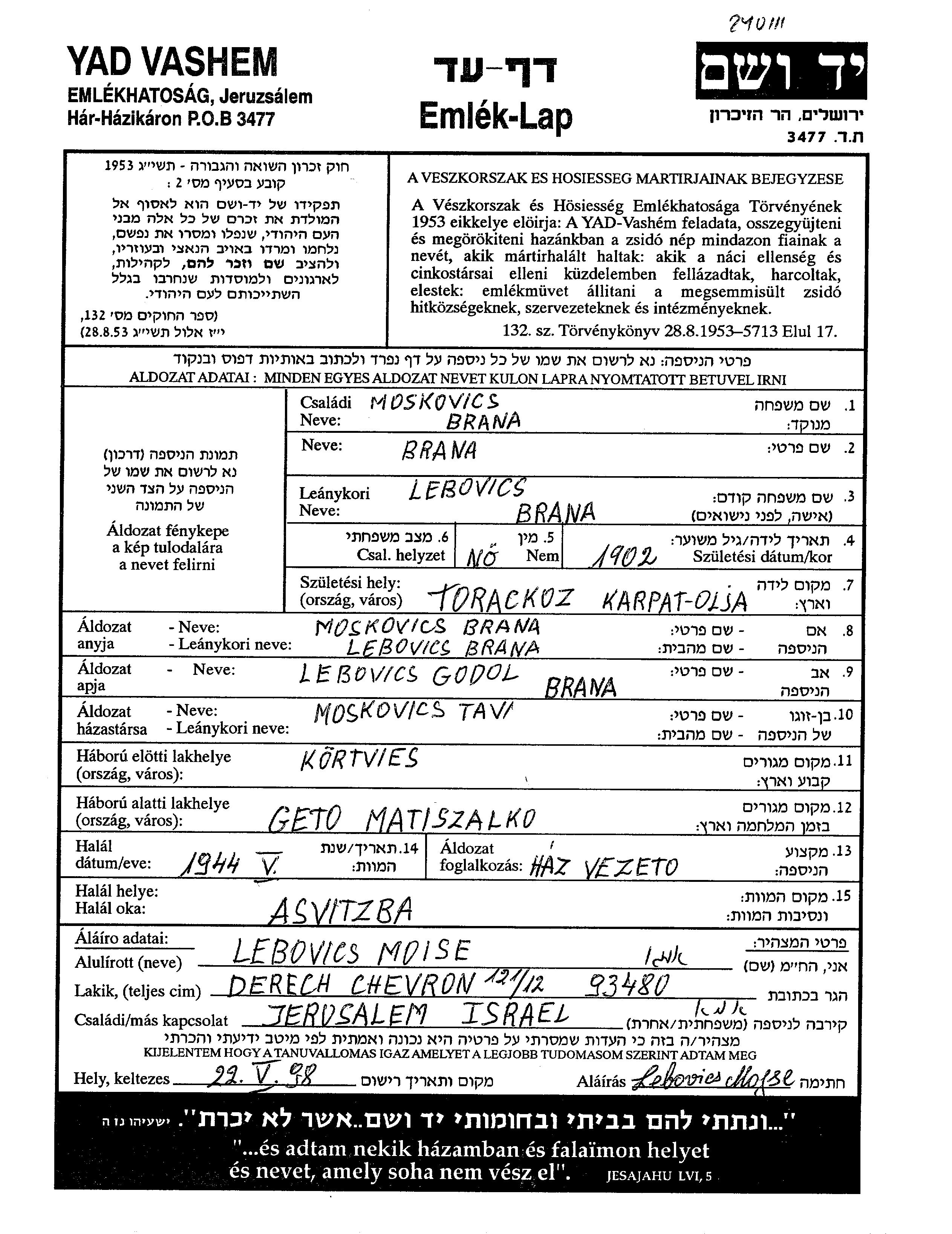 Brana Moskovics, geb. Lebovics wurde im Jahr 1902 in Taraczkoz, Tschechoslowakei geboren. Sie war Hausfrau und mit Tovi Verheiratet. Vor dem Zweiten Weltkrieg lebte sie in Kortvelyes, Ungarn. Während des Krieges war sie in Mateszalka, Ungarn.