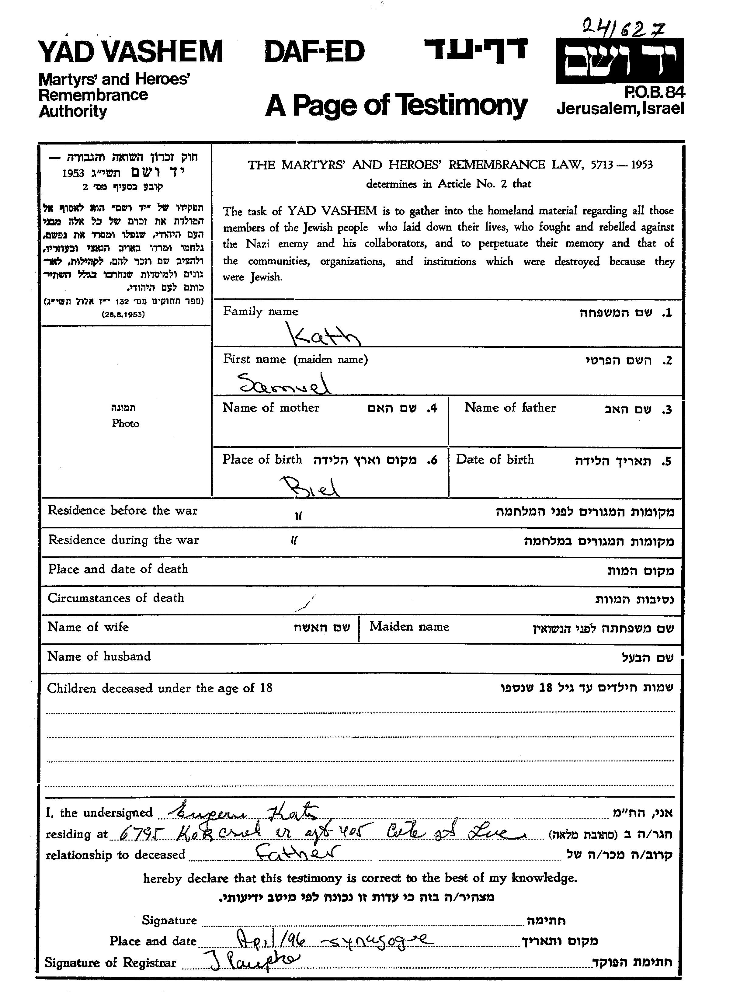 Shmuel Katz wurde in Biel, Tschechoslowakei geboren. Er war mit Hermina Verheiratet. Vor dem Zweiten Weltkrieg lebte er in Biel, Tschechoslowakei. Während des Krieges war er in Biel, Tschechoslowakei.