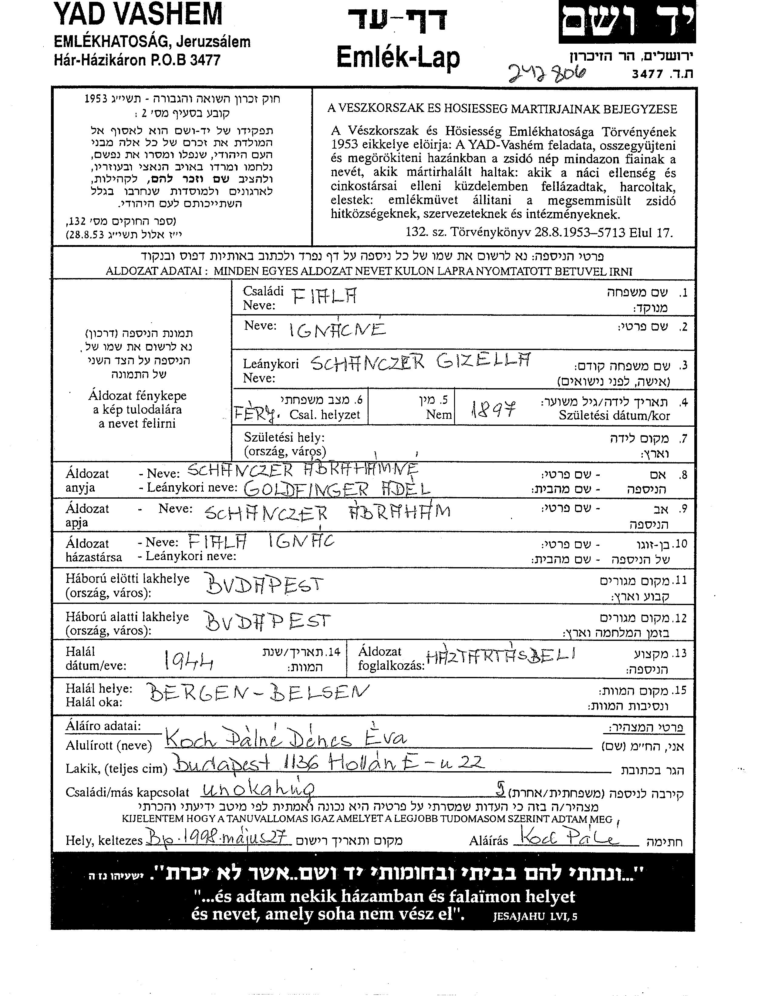 Gizella Fiala, geb. Schanczer wurde im Jahr 1897 geboren. Sie war die Tochter von Abraham und Adel Edel, geb. Goldfinger. Sie war Hausfrau und mit Ignac Verheiratet. Vor dem Zweiten Weltkrieg lebte sie in Budapest, Ungarn. Während des Krieges war sie in Budapest, Ungarn.