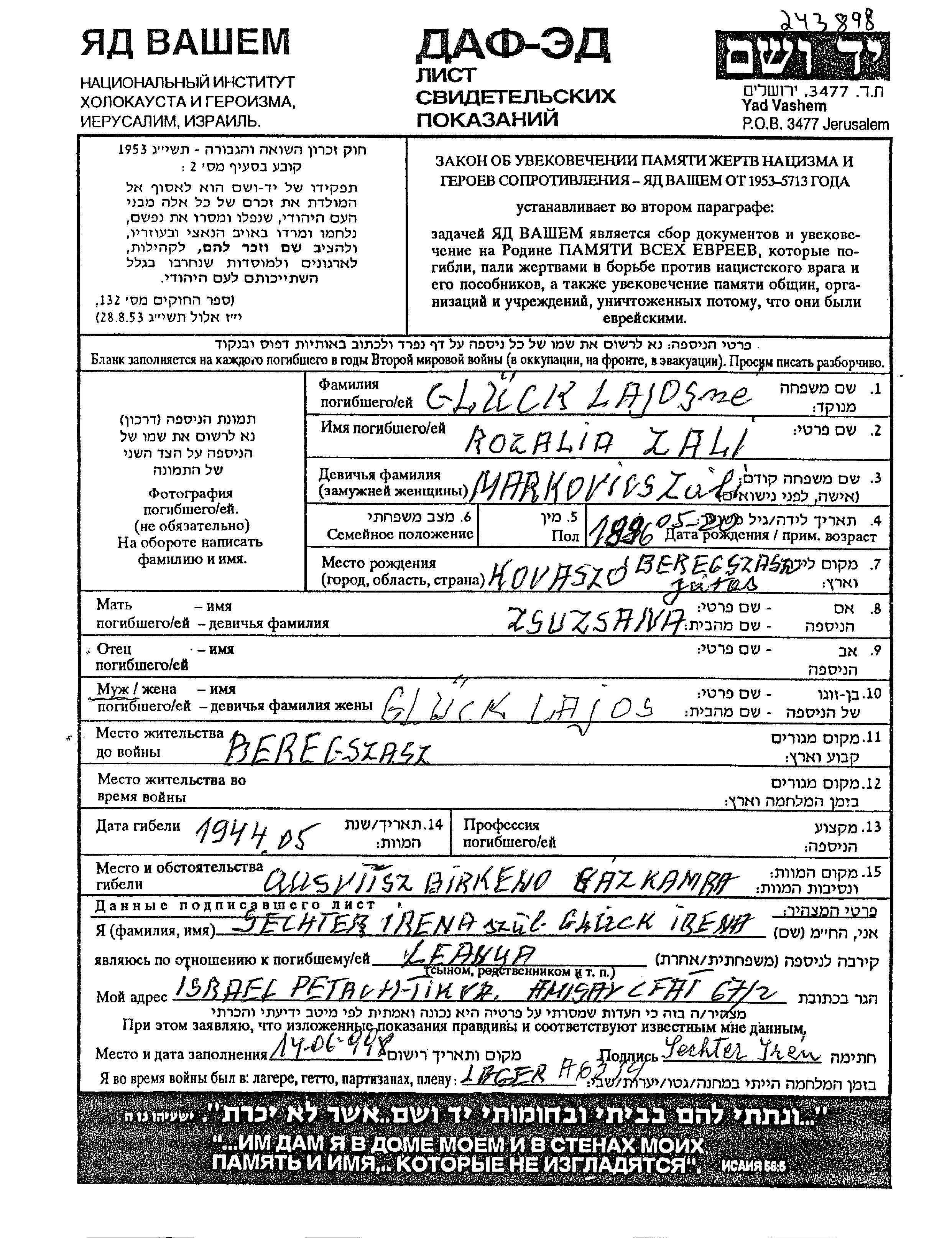 Rozalia Glük, geb. Markovics wurde im Jahr 1896 in Kovaszo, Tschechoslowakei geboren. Sie war die Tochter von Zsuzsana. Sie war mit Lajos Verheiratet. Vor dem Zweiten Weltkrieg lebte sie in Beregszasz, Tschechoslowakei. Während des Krieges war sie in Beregszasz, Tschechoslowakei.