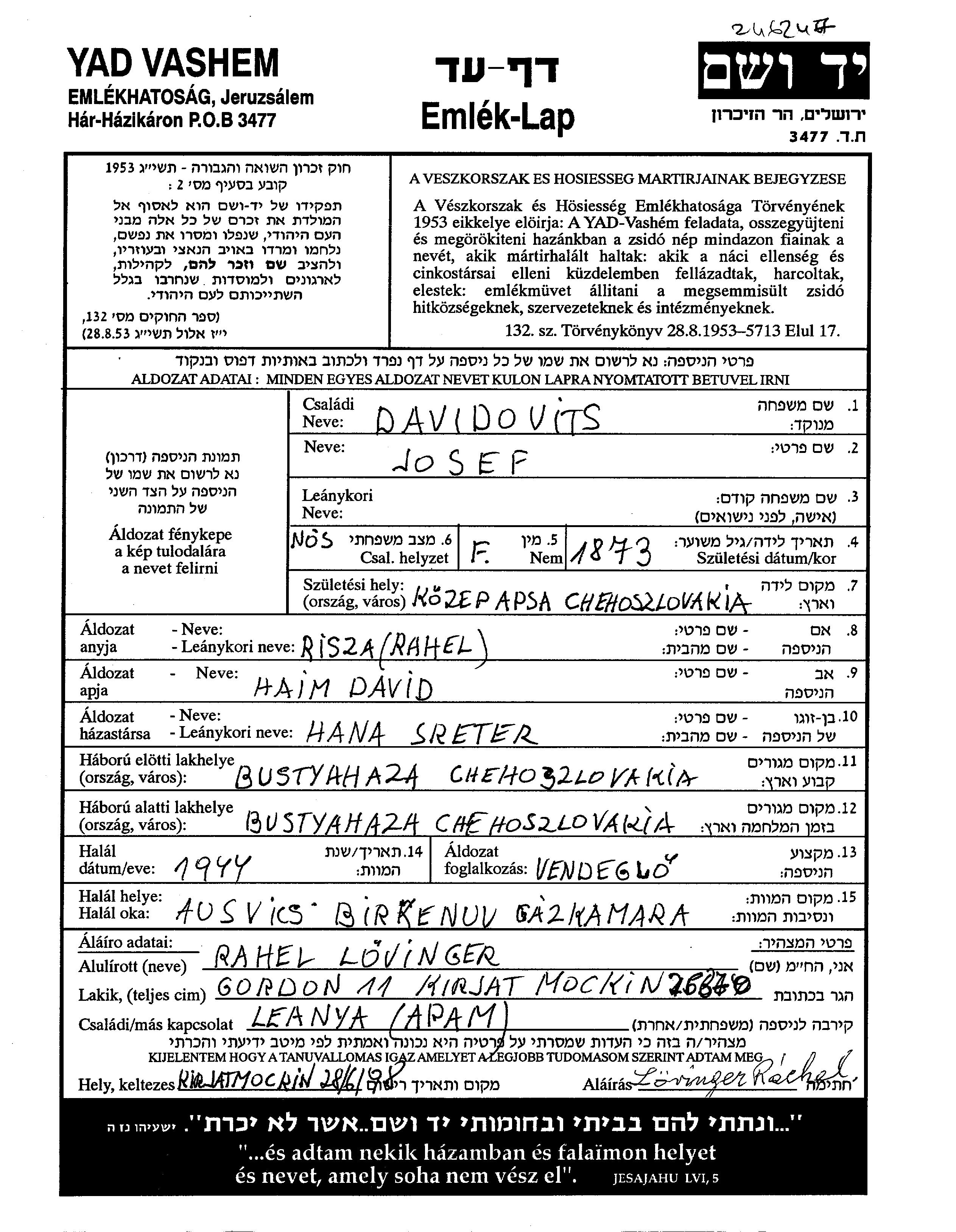 Josef Davidovits wurde im Jahr 1873 in Kozepapsa, Tschechoslowakei geboren. Er war der Sohn von Haim David und Risza. Er war mit Hana Verheiratet. Vor dem Zweiten Weltkrieg lebte er in Bustyahaza, Tschechoslowakei. Während des Krieges war er in Bustyahaza, Tschechoslowakei.