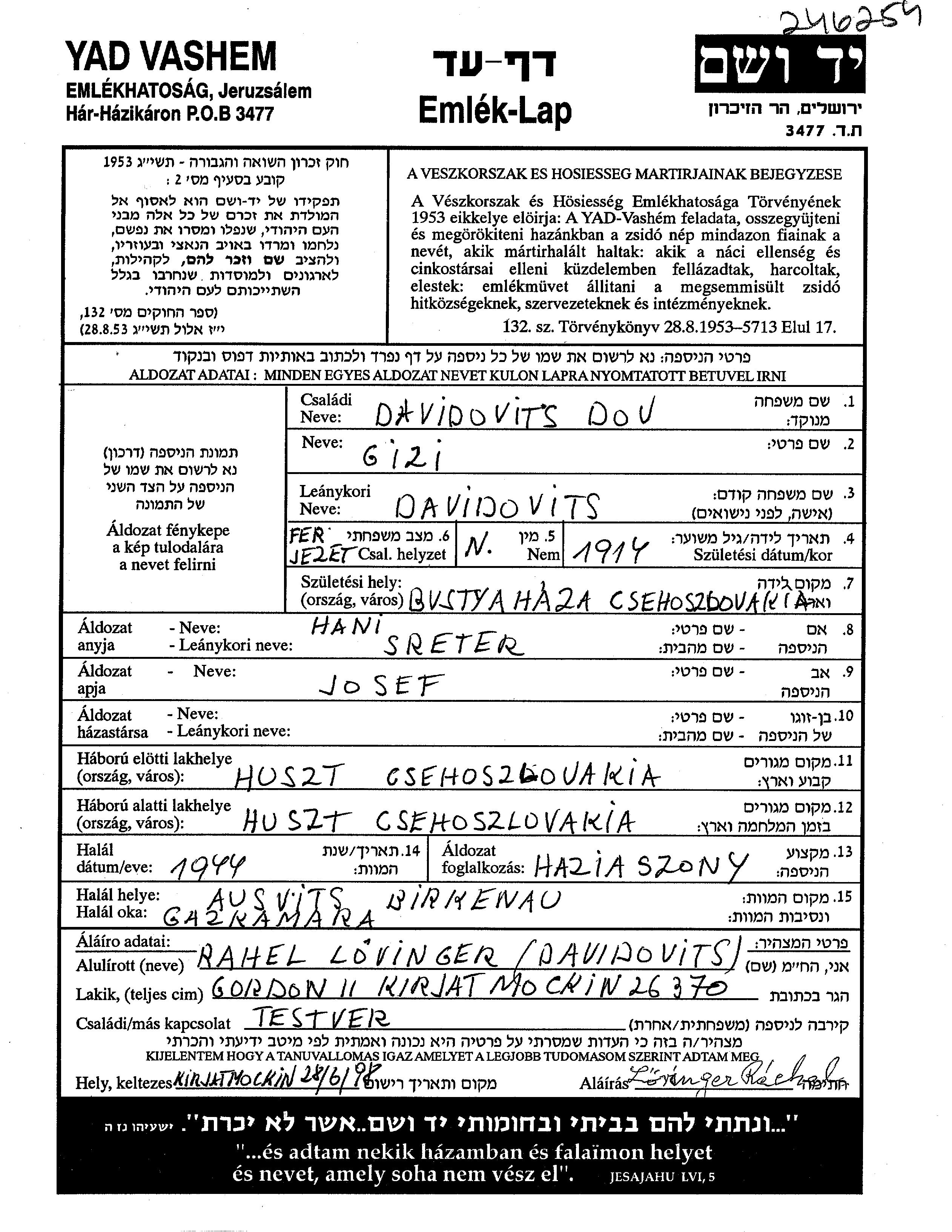 Gizi Davidovits, geb. Davidovits wurde im Jahr 1914 in Bustyahaza, Tschechoslowakei geboren. Sie war die Tochter von Josef und Hani Khani, geb. Sreter. Sie war mit Dov Verheiratet. Vor dem Zweiten Weltkrieg lebte sie in Huszt, Tschechoslowakei. Während des Krieges war sie in Huszt, Tschechoslowakei.