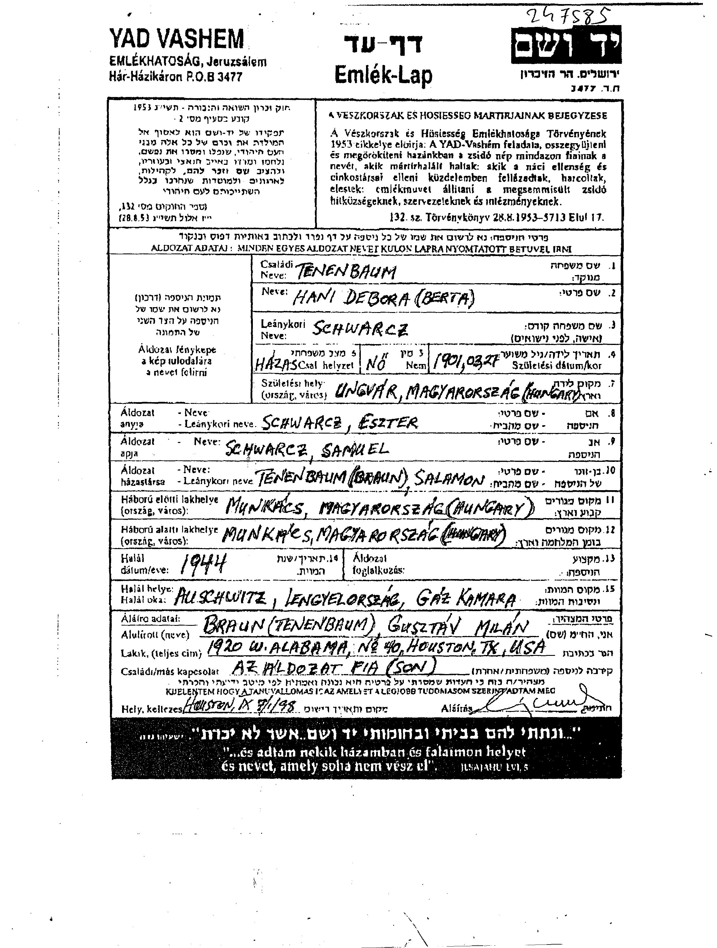 Hani Debora Khani Berta Tenenbaum Braun, geb. Schwarcz wurde im Jahr 1901 in Ungvar, Tschechoslowakei geboren. Sie war die Tochter von Shmuel und Eszter. Sie war Verheiratet. Vor dem Zweiten Weltkrieg lebte sie in Munkacs, Tschechoslowakei. Während des Krieges war sie in Munkacs, Tschechoslowakei.