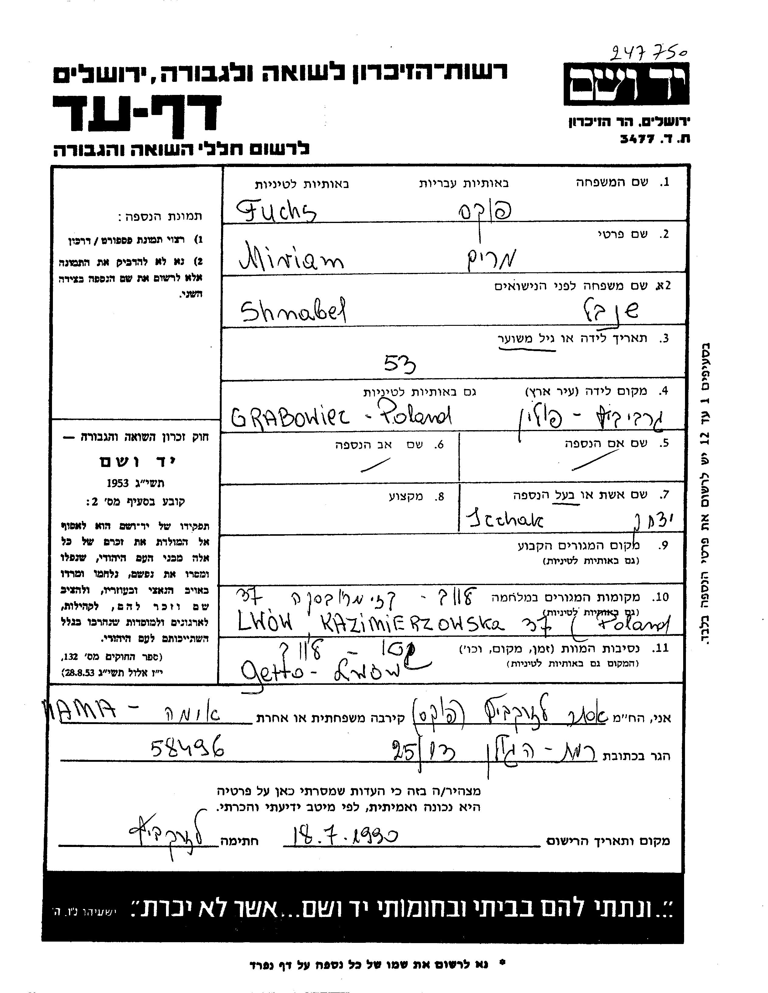 Miriam Fuchs, geb. Shnabel wurde in Grabowiec, Polen geboren. Sie war mit Icchak Verheiratet. Vor dem Zweiten Weltkrieg lebte sie in Polen. Während des Krieges war sie in Lwow, Polen.