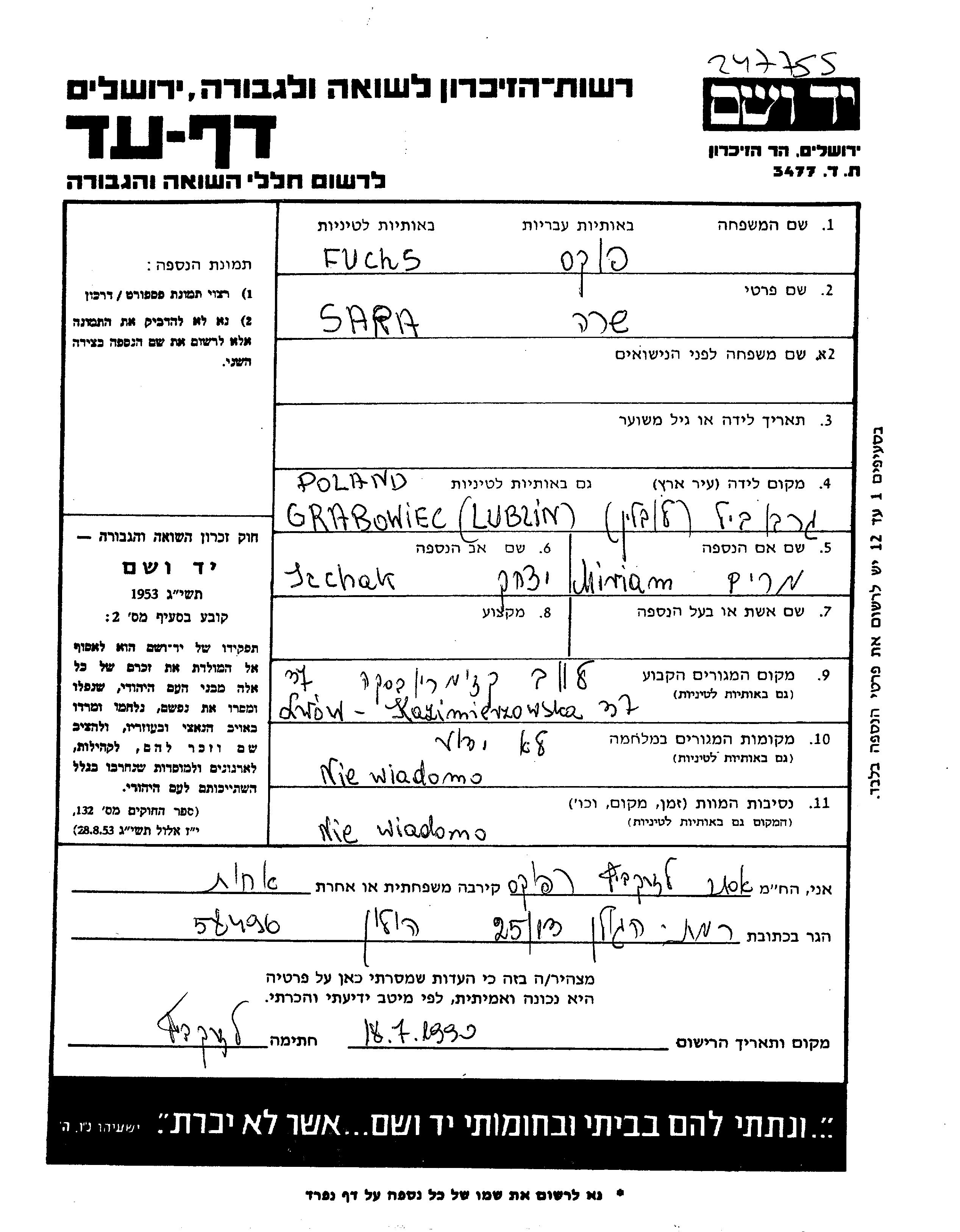 Sara Fuchs wurde in Grabowiec, Polen geboren. Sie war die Tochter von Icchak und Miriam, geb. Shnabel. Vor dem Zweiten Weltkrieg lebte sie in Lwow, Polen.