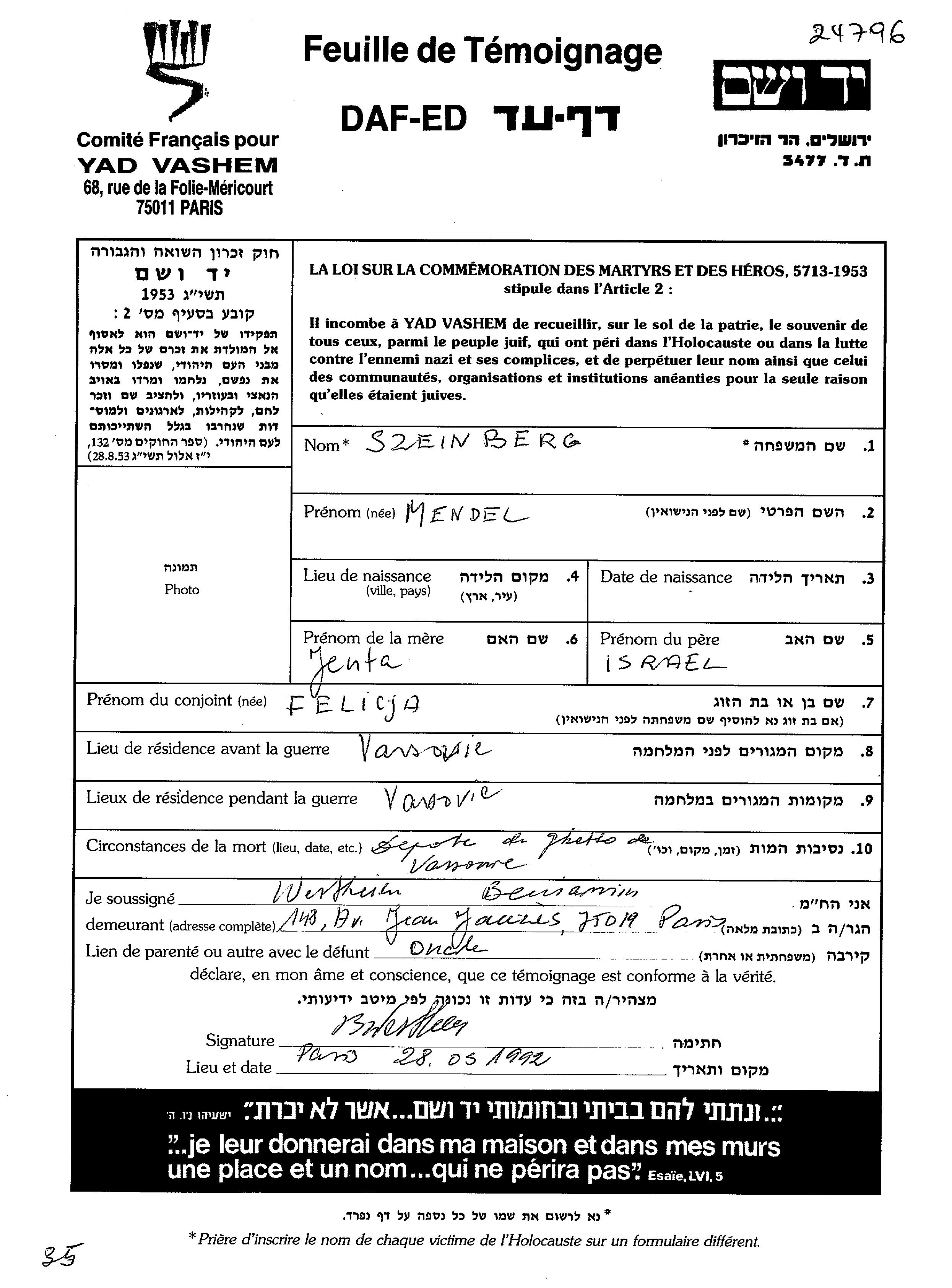 Mendel Szeinberg wurde Er war der Sohn von Israel und Jenta. Er war mit Felicja Verheiratet. Vor dem Zweiten Weltkrieg lebte er in Warszawa, Polen. Während des Krieges war er in Warszawa, Polen.